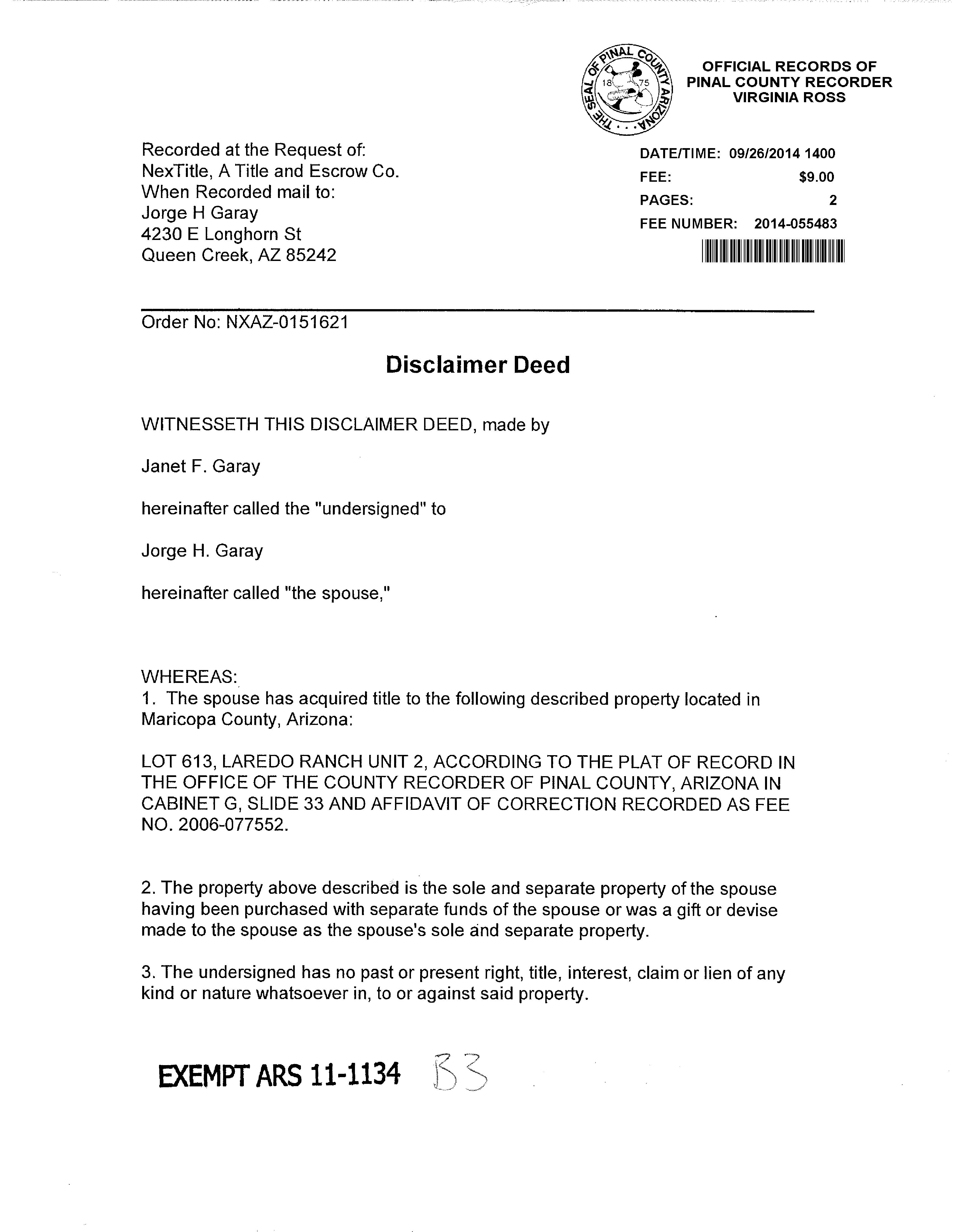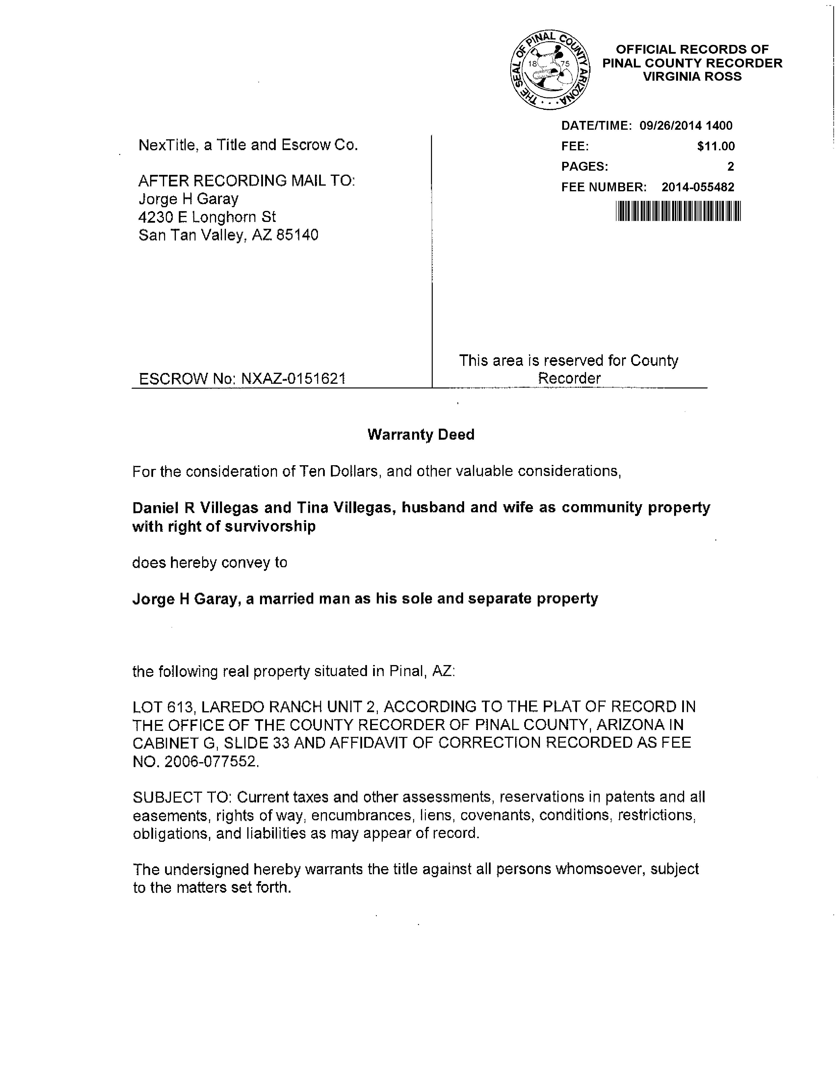 Owner Name: Garay Jorge H / APN / Alternate APN: 109-27-614 / Deed Type: Warranty Deed