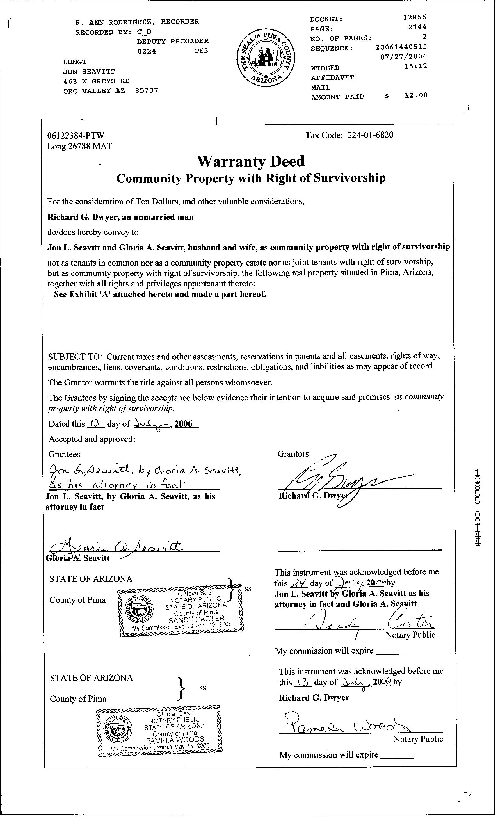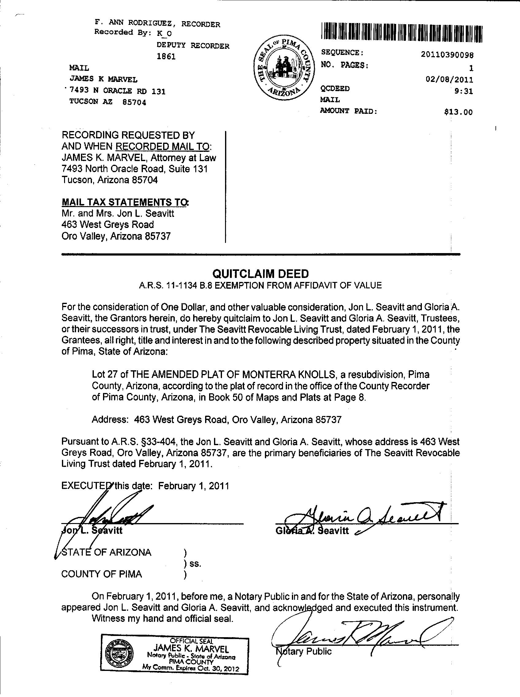 MAIL: ATTN: JON L & GLORIA A SEAVITT TR  463 W GREYS RD  ORO VALLEY AZ 85737-3707