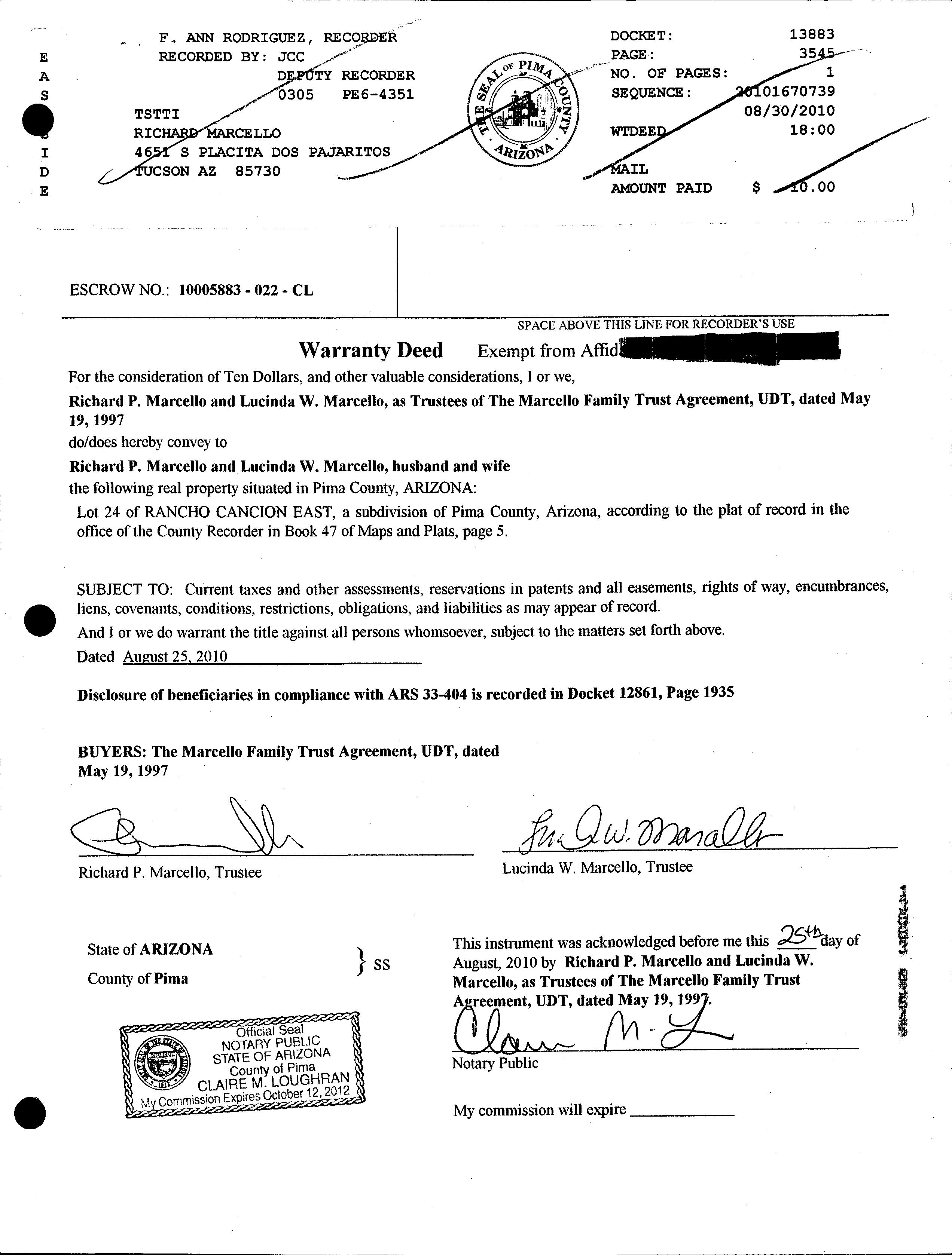 Recording/Sale Date : 01/27/2011 / 08/25/2010