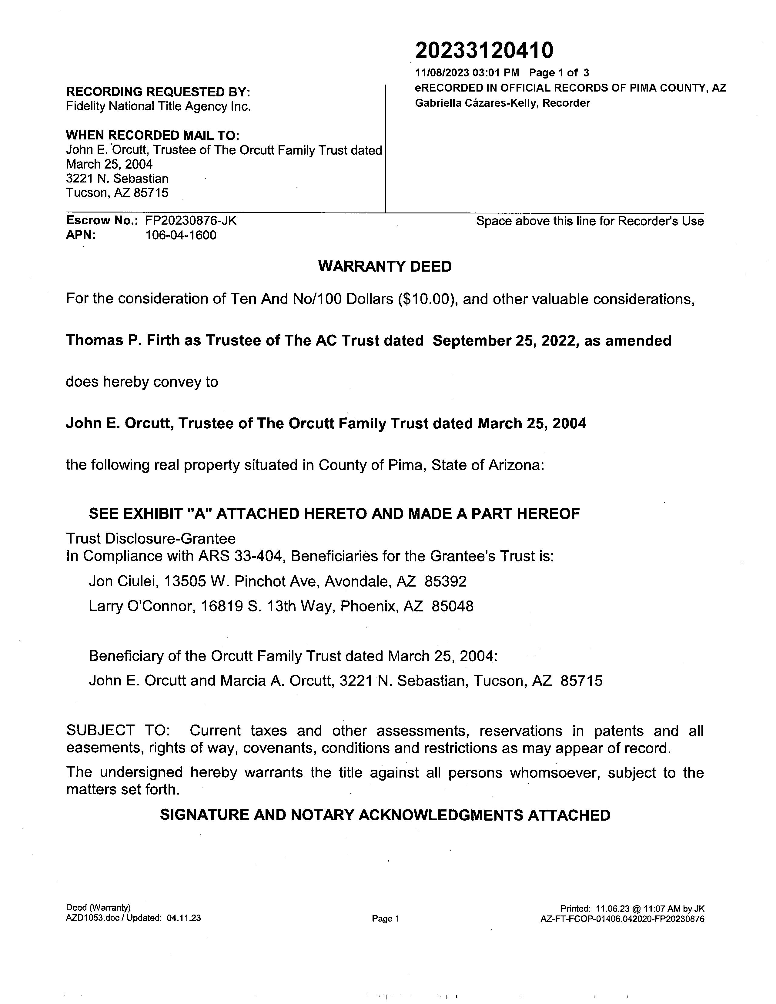 Owner Name: Orcutt Family Trust / APN / Alternate APN: 106-04-1600 / Deed Type: Warranty Deed