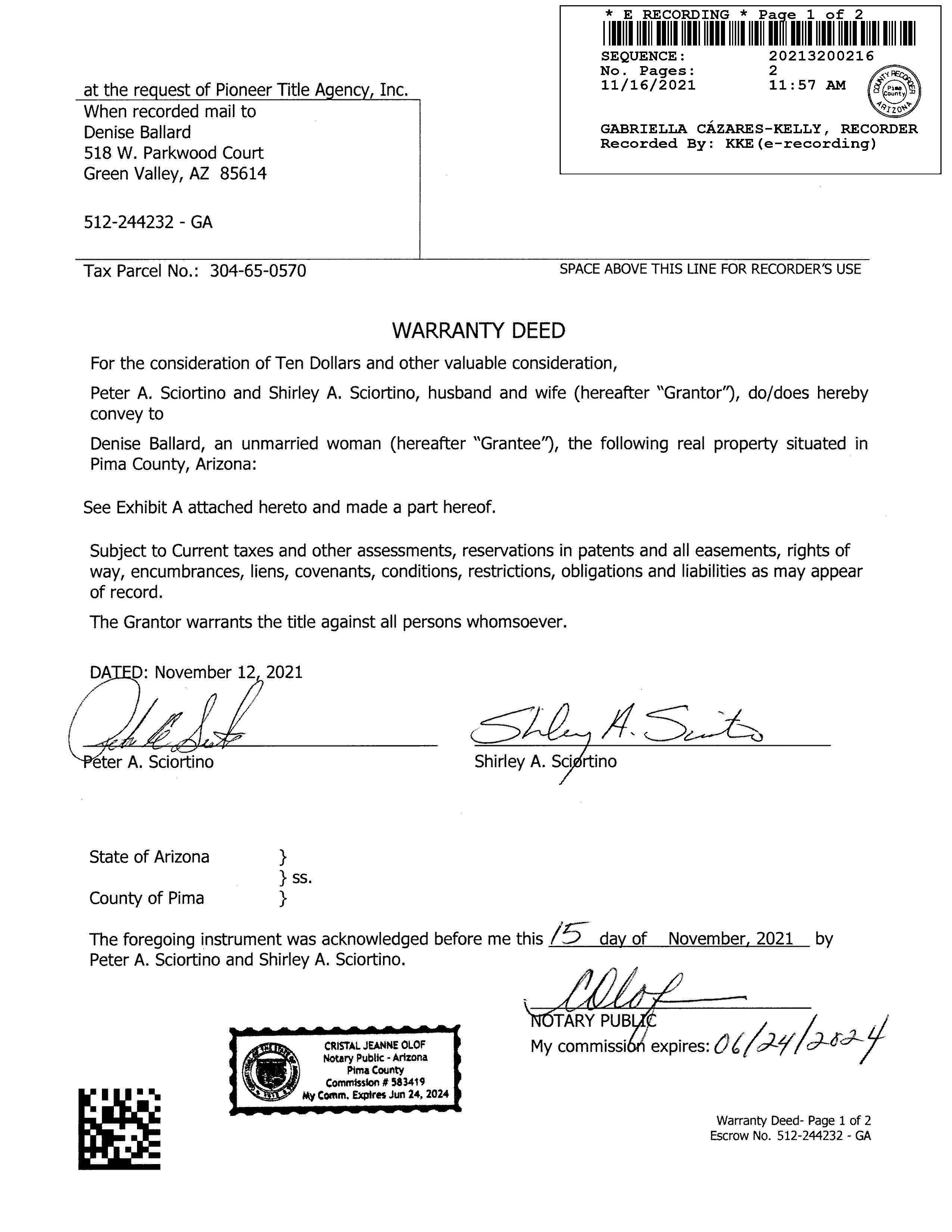 Mailing Address : 518 W Parkwood Ct, Green Valley AZ 85614-3519 C062