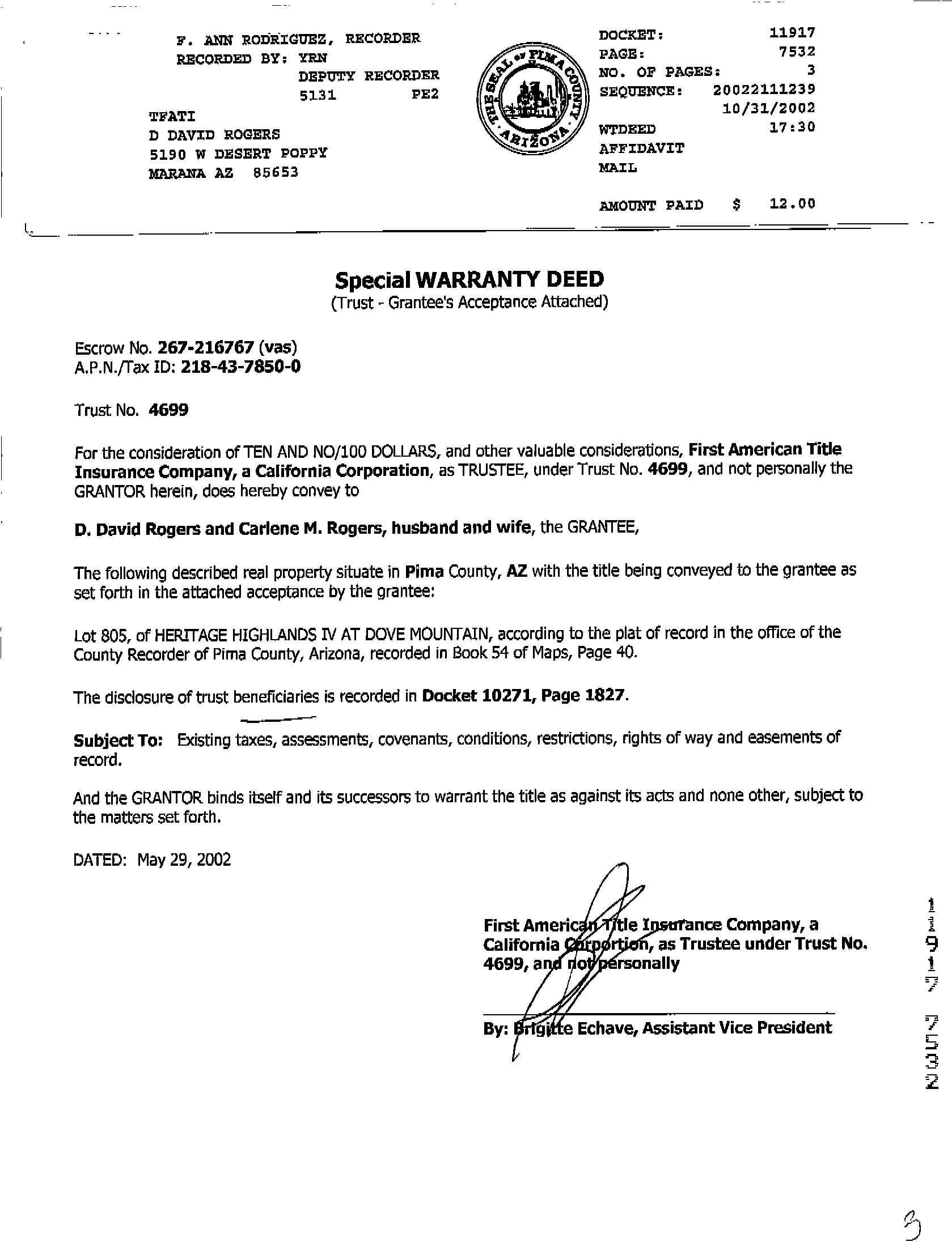 This report is not an insured product or service or a representation of the condition of title to real property. It is not an abstract, legal opinion, opinion of title, title insurance commitment or preliminary report, or any form of Title Insurance or Guaranty. This report is issued exclusively for the benefit of the Applicant therefor and may not be used or relied upon by any other person. This report may not be reproduced in any manner without First Americans prior written consent. First American does not represent or warrant that the information herein is complete or free from error, and the information herein is provided without any warranties of any kind, as-is, and with all faults. As a material part of the consideration given in exchange for the issuance of this report, recipient agrees that First Americans sole liability for any loss or damage caused by an error or omission due to inaccurate information or negligence in preparing this report shall be limited to the fee charged for the report. Recipient accepts this report with this limitation and agrees that First American would not have issued this report but for the limitation of liability described above. First American makes no representation or warranty as to the legality or propriety of recipient's use of the information herein.