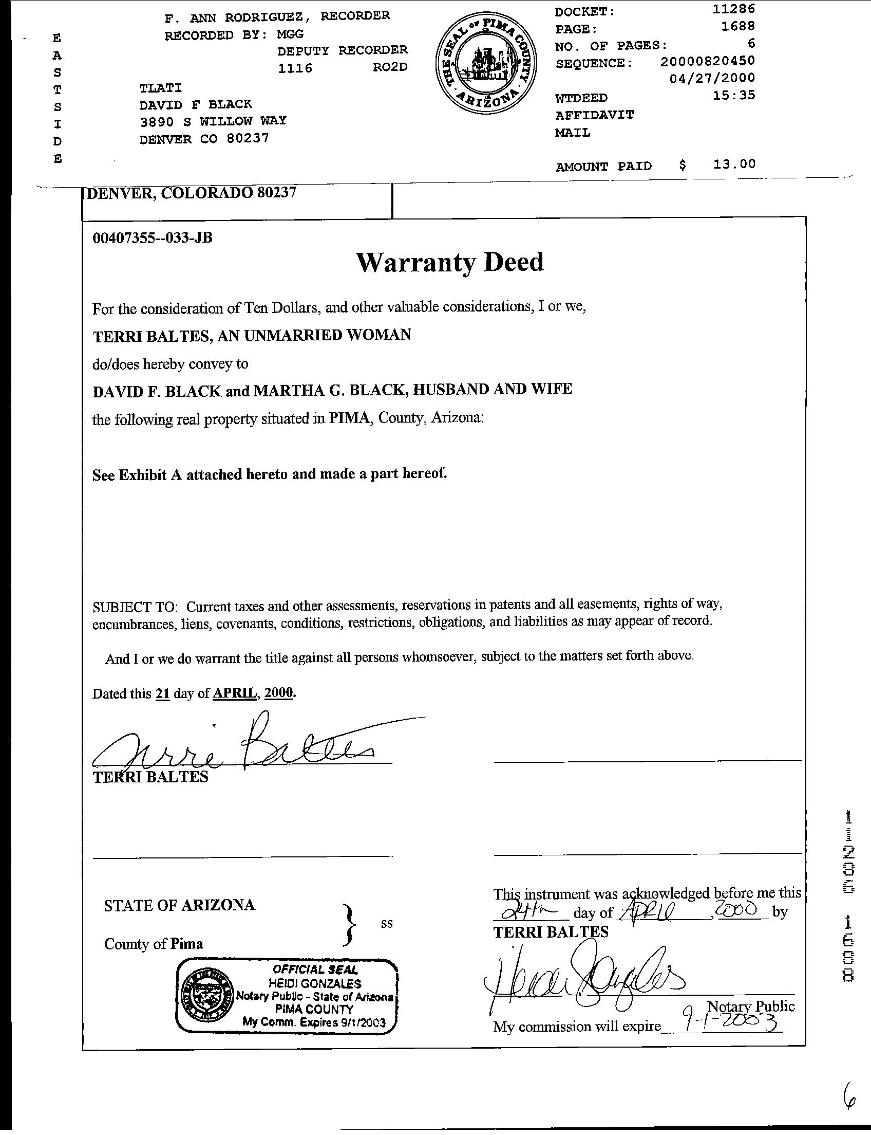10729 2955 SD FIDELITY NATIONAL T10780 10/01/1997 10642 2279 WD CONTRAVEST PROPERTIES INC 10/01/1997 10642 2273 FIDELITY NATIONAL T10780 10/01/1997 242,000 10642 2271 SD TITLE GUARANTY T1253 M ADDITIONAL PROPERTY INFORMATION STANDARD LAND USE: SFR