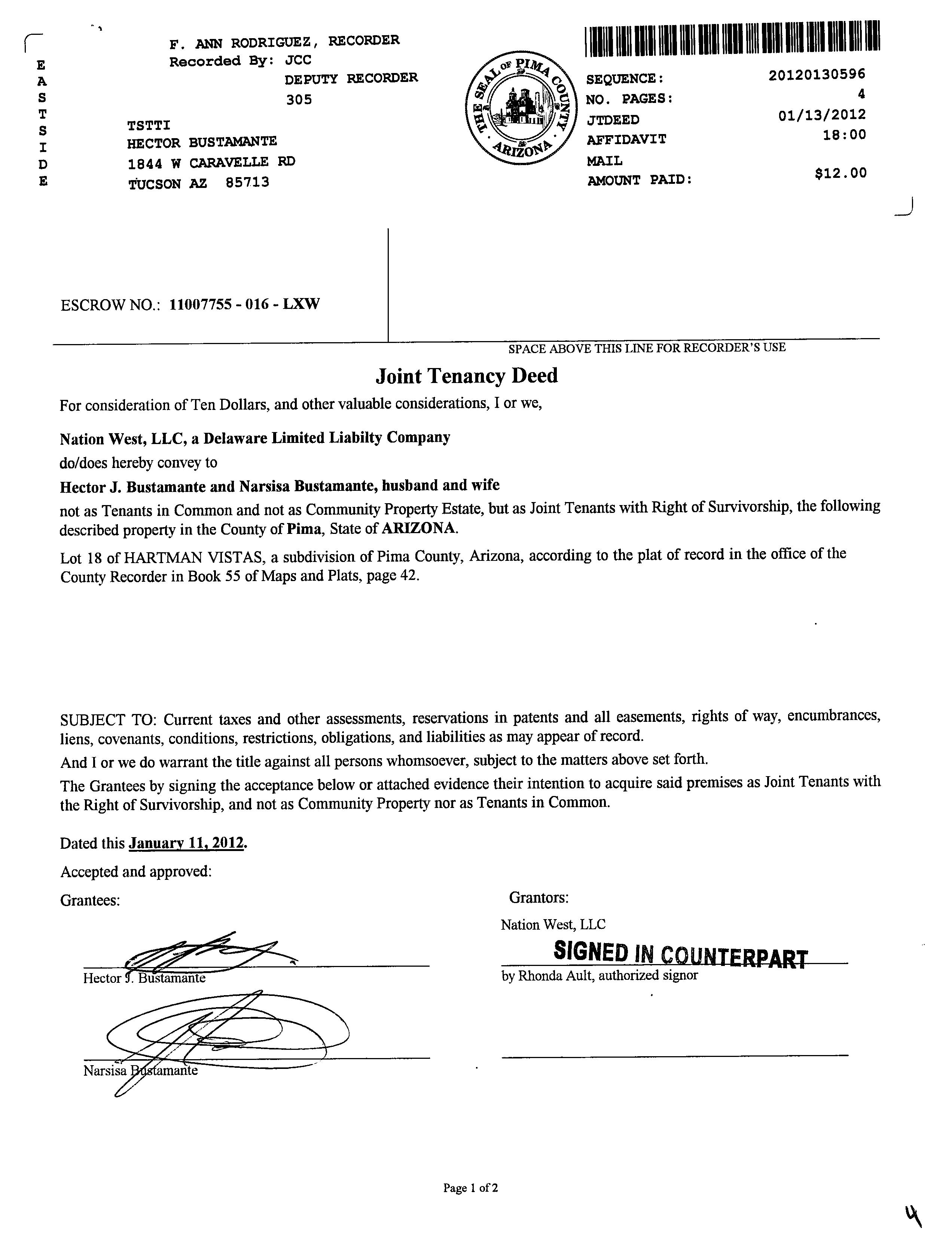 PrimaryOwnerName(s) BUSTAMANTEHECTORJ&NARSISA(JT/RS) Vesting JointTenantswithRightofSurvivorship