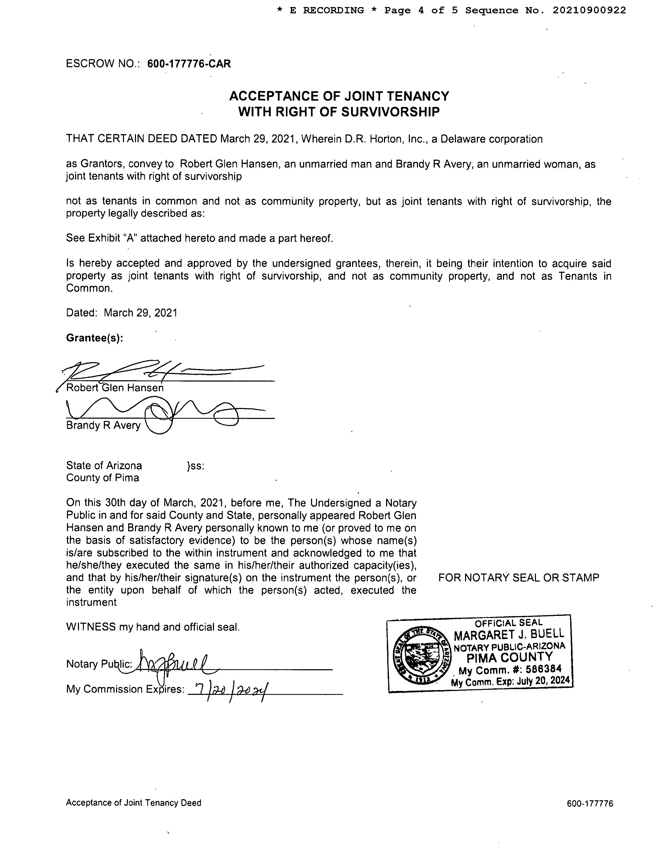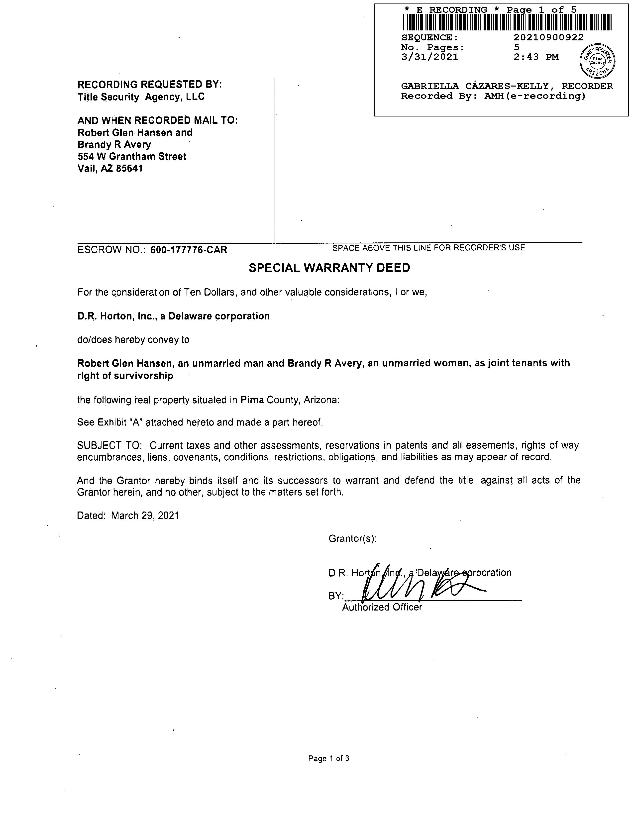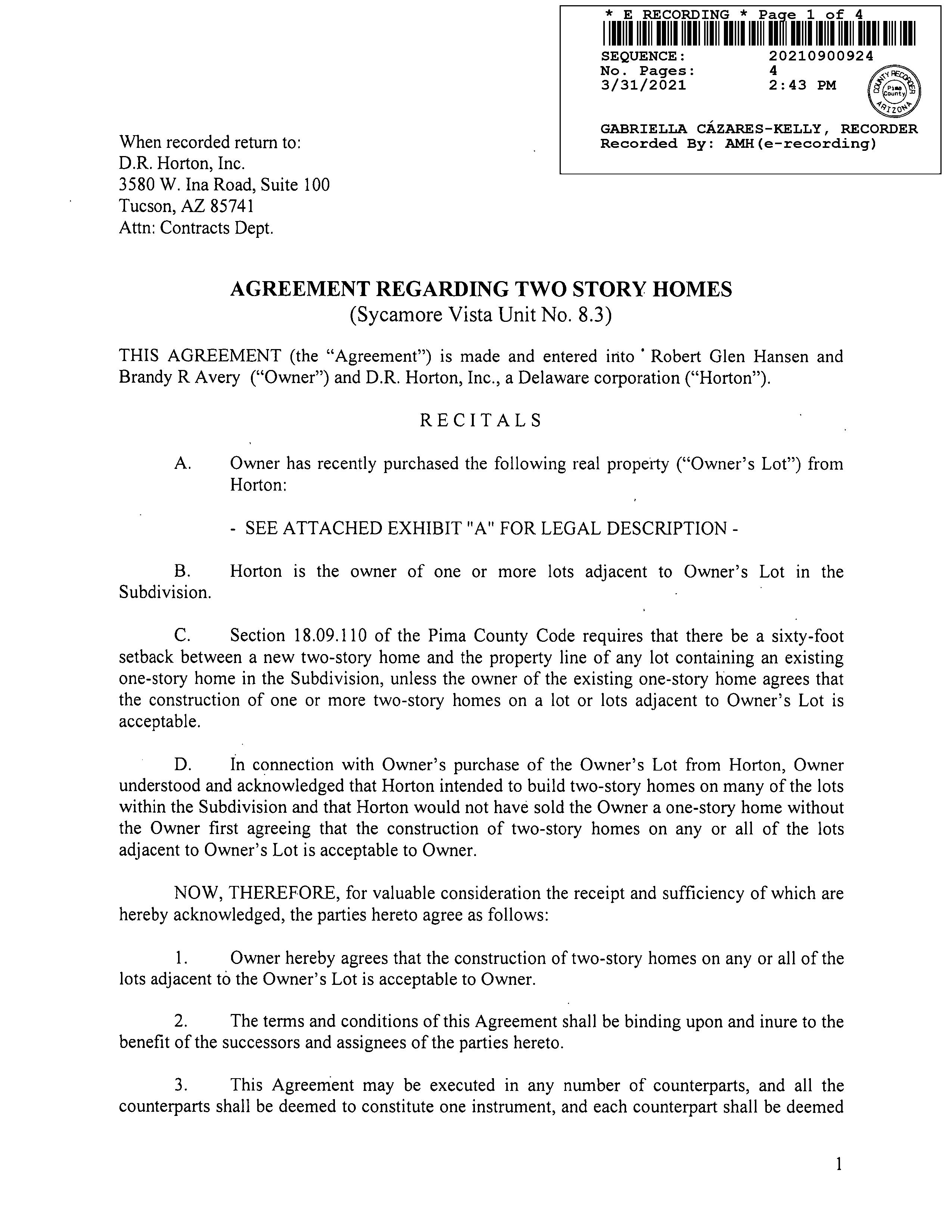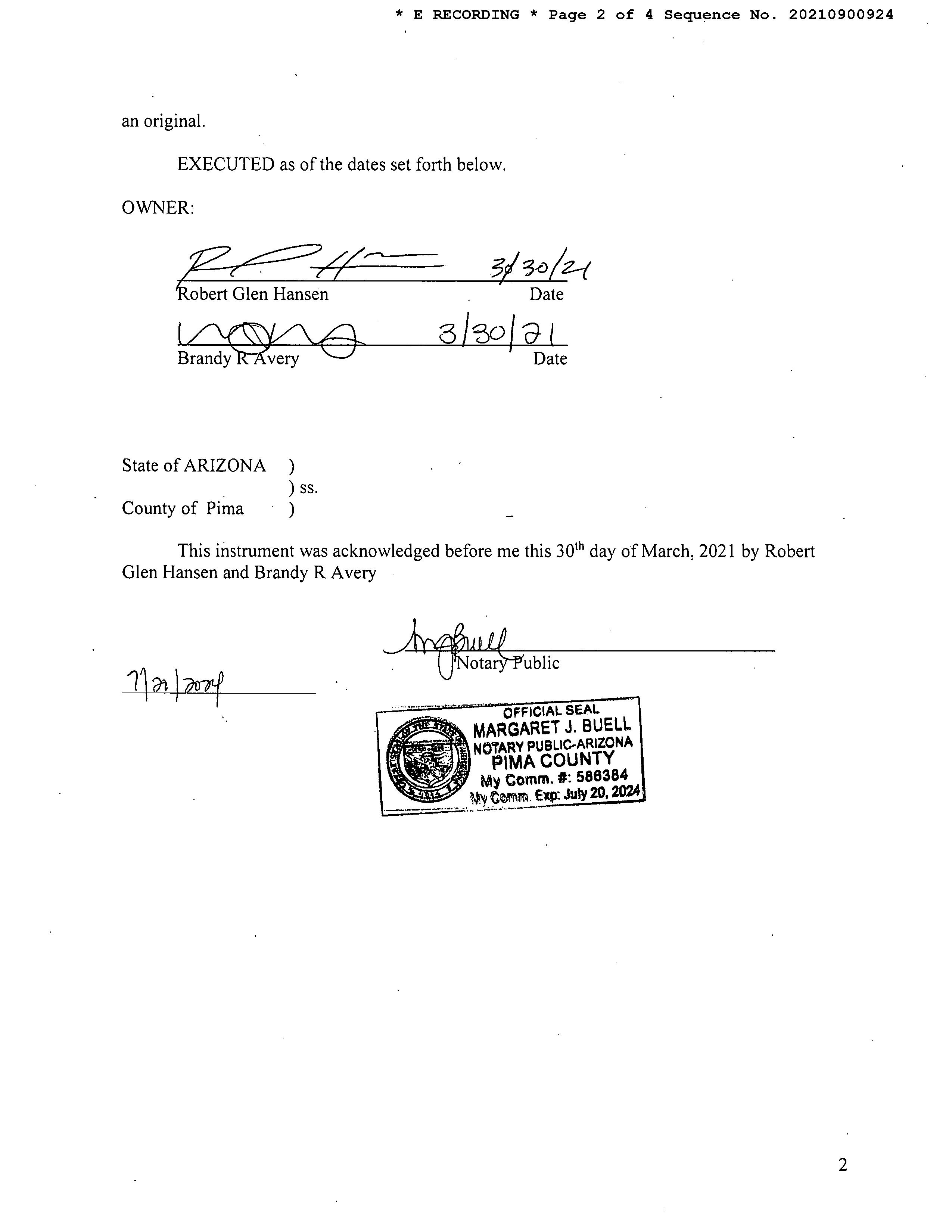 OWNER: HANSEN ROBERT GLEN & AVERY AFFIDAVIT 2021 900922 03/31/2021