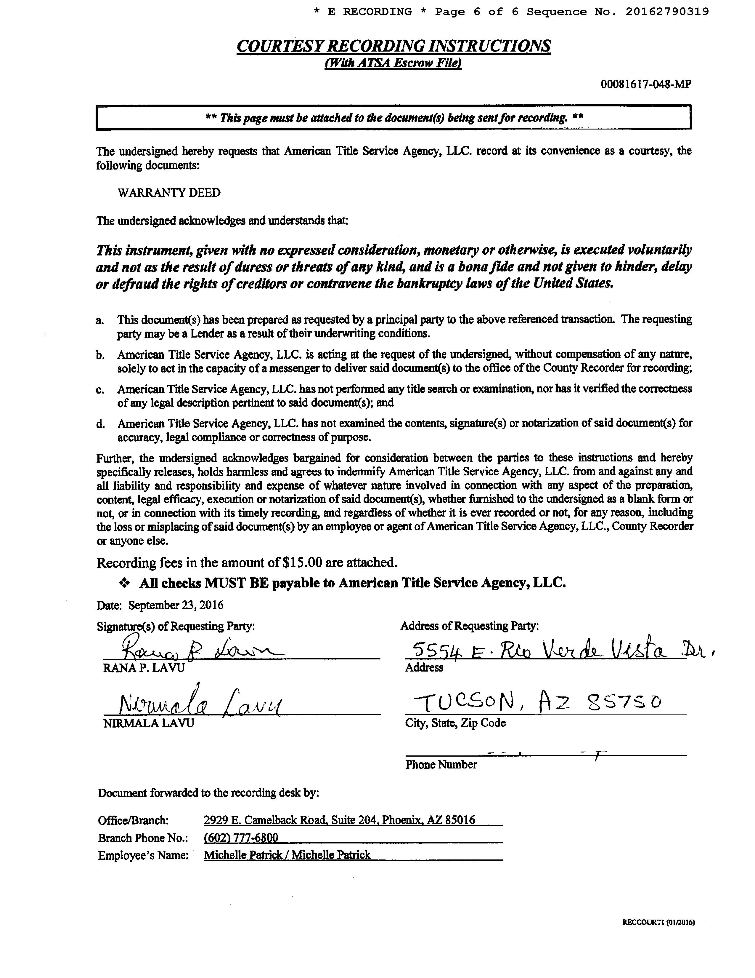 MAIL: ATTN: RANA PRATAP & NIRMALA LAVU 5554 E RIO VERDE VISTA DR TUCSON AZ 85750-6740