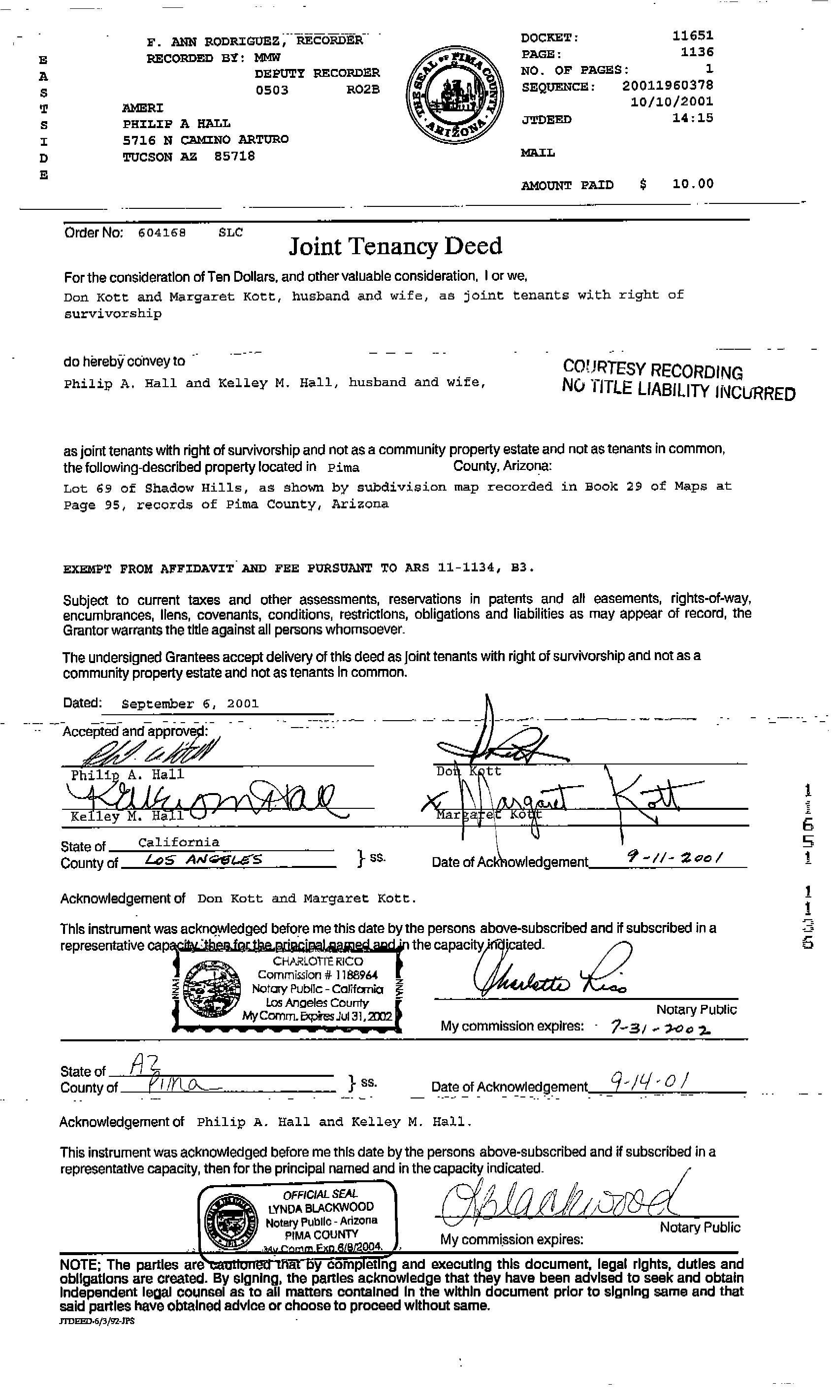 This information is furnished without fee and without benefit of a complete title search. No liability is assumed by First American Title. If it is desired that liability be assumed, you may apply for a policy of title insurance with First American Title Insurance Company.