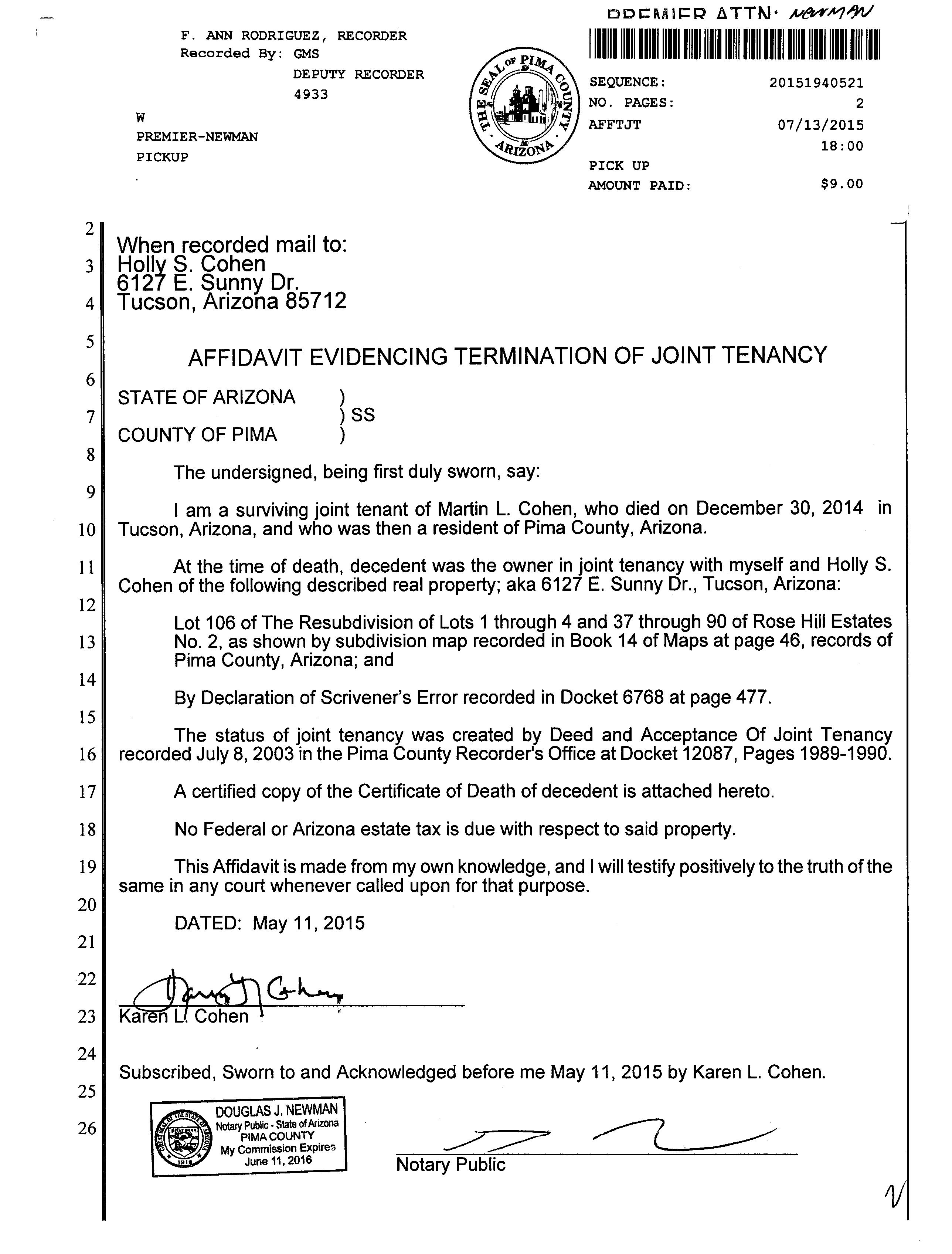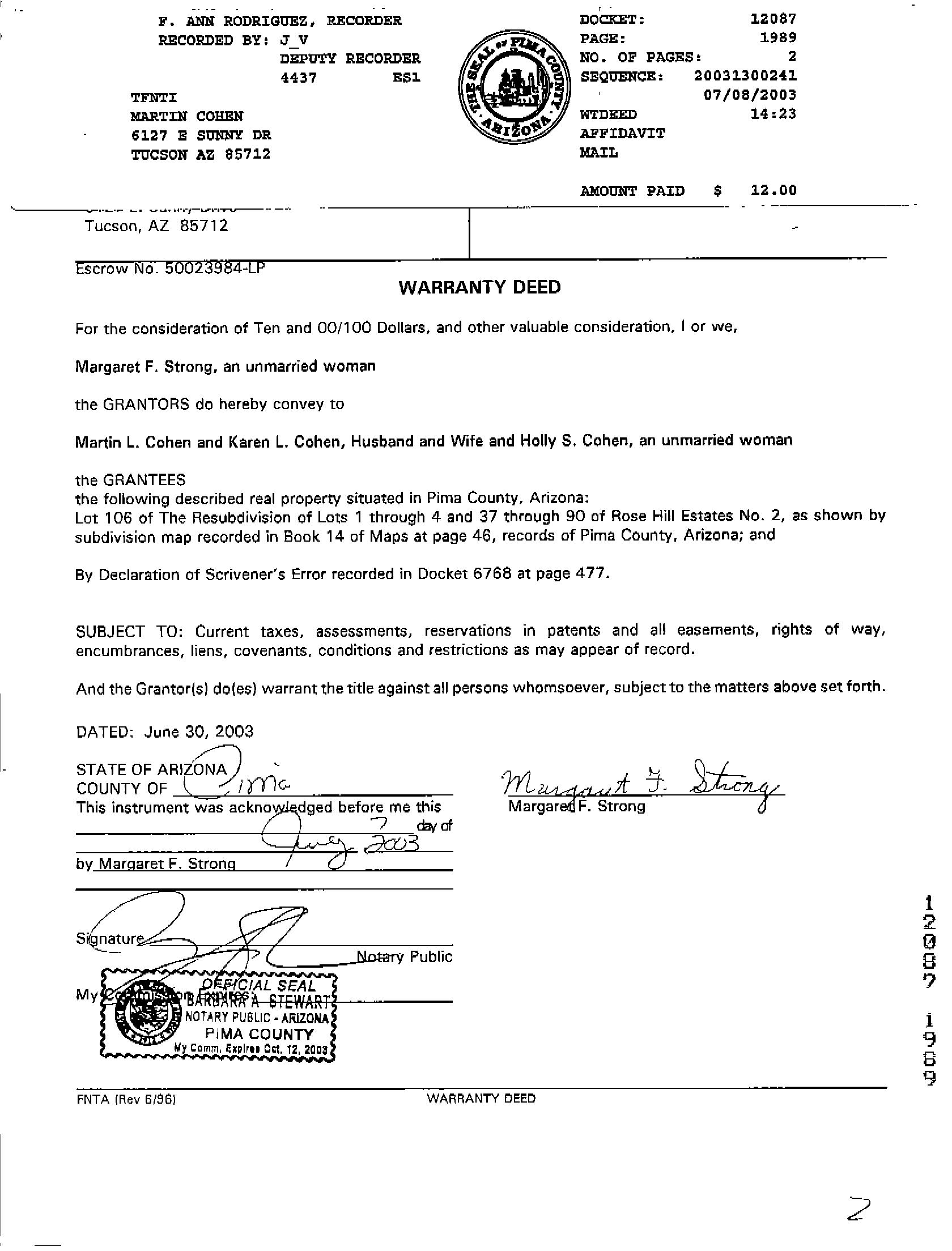 Owner Name: Cohen Karen L /Cohen Holly S APN / Alternate APN: 121-01-1790 / Deed Type: Warranty Deed