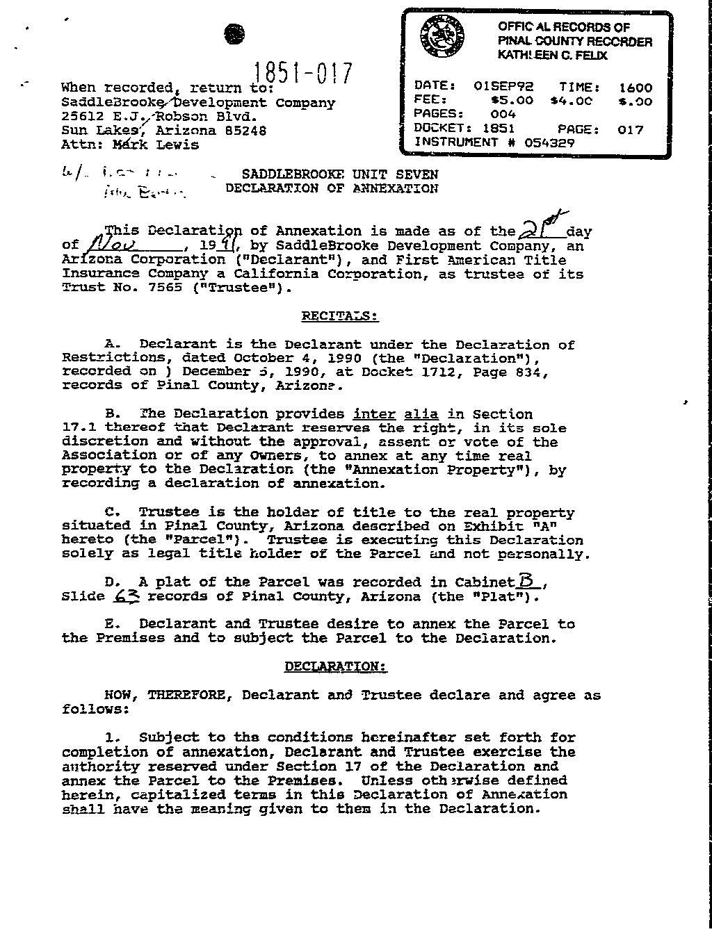 LEGAL: SADDLEBROOKE UNIT SEVEN: LOT 1 CENT POR W1/2 E1/2 SEC 27-10S-14E 8131 SQ FT CAB B SLD 63 CURRENT TAXES INFORMATION THROUGH 01/15/2025