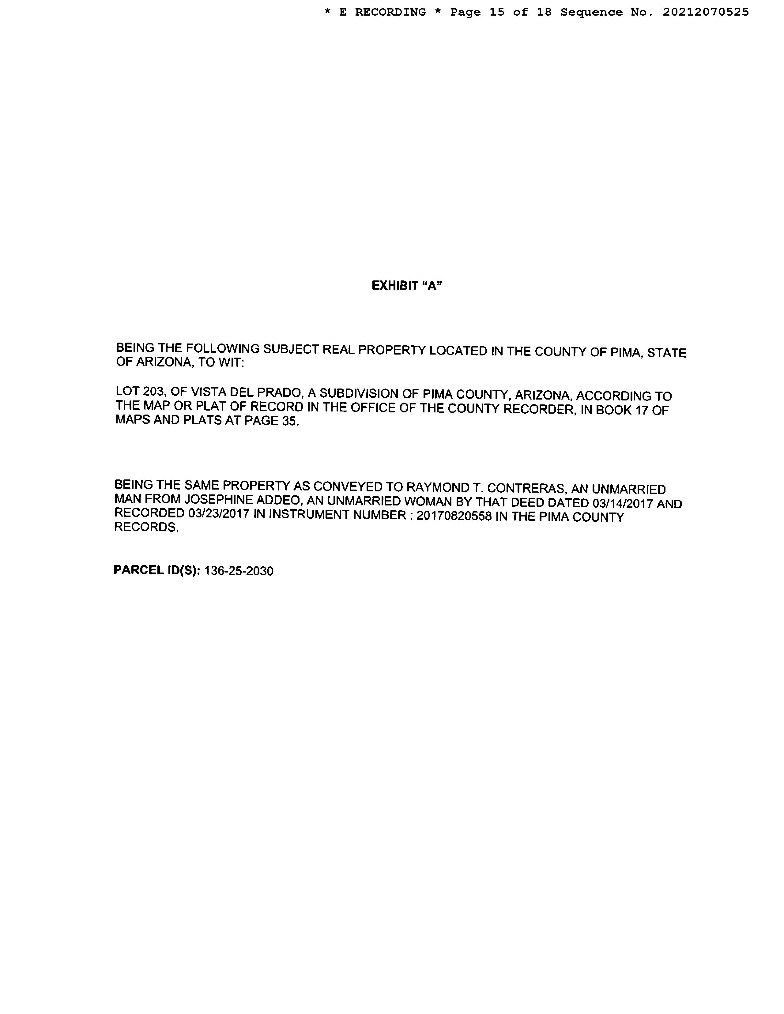 Legal Description : Vista Del Prado Lot 203 County : Pima, Az APN : 136-25-2030 Census Tract / Block : 40.33 / 2 Subdivision : Vista Del Prado Township-Range- Sect : 14S-15E-30 Map Reference : 30-14S-15E