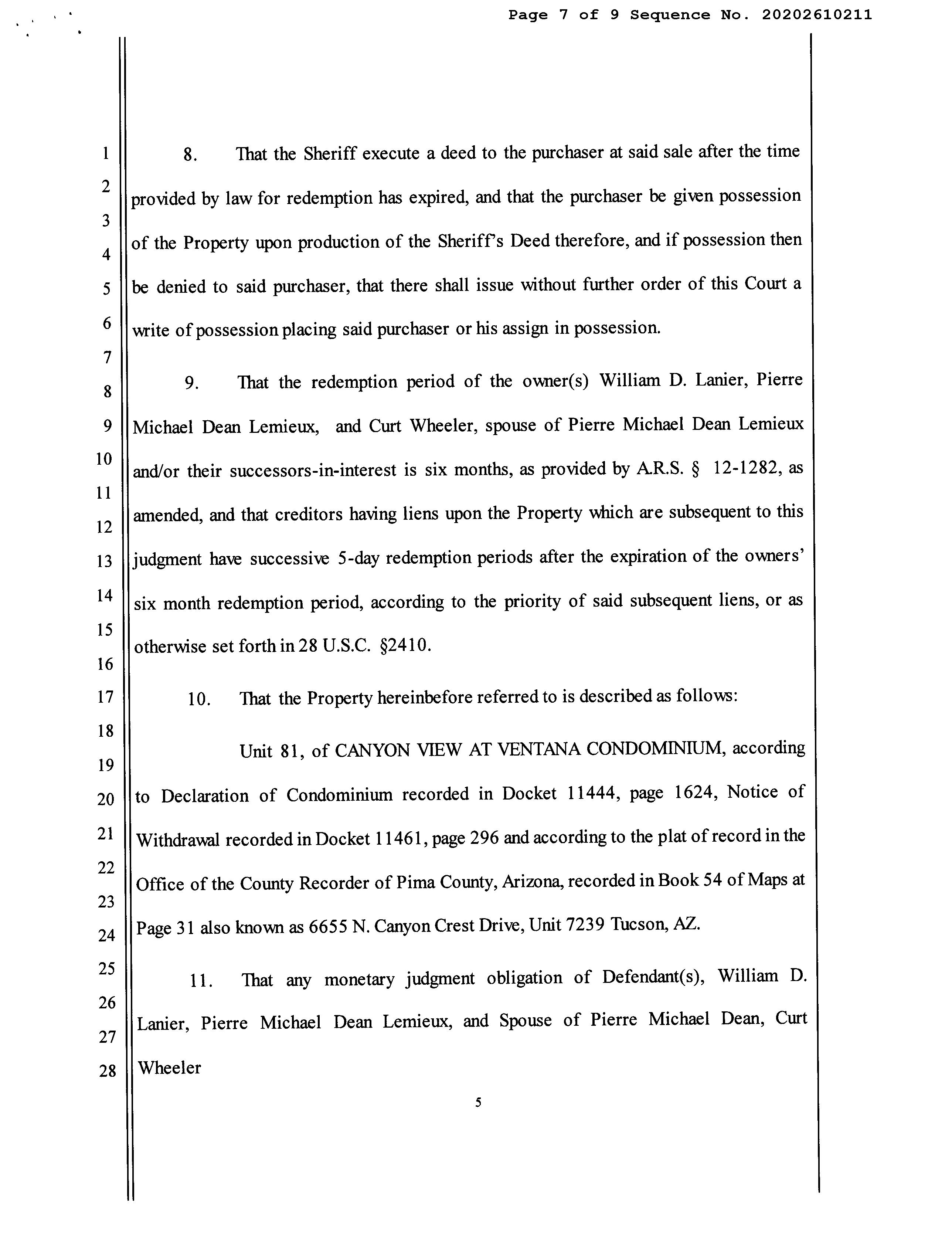 Subject Property: 6655 N Canyon Crest Dr # 7 Tucson Az 85750 Owner Name: Lemieux Pierre Michael Dean /Lanier William L APN / Alternate APN: 114-03-5120 / Deed Type: Special Warranty Deed Land Use: Condominium Subdivision / Tract: Canyon View At Ventana Condo / Lot Size: Year Built / Eff: 1986 / Rec. Date / Price: 04/24/2001 / $121,410 Living Area: 1,056 # of units: Document #: 11534-2746 Bedrooms: Pool: Total Tax Value: $200,434 Bath(F/H): / #1 6655 N Canyon Crest Dr # 6 Tucson Az 85750 Owner Name: Canyon View 6 Llc / APN / Alternate APN: 114-03-4940 / Deed Type: Warranty Deed Land Use: Condominium Subdivision / Tract: Canyon View At Ventana Condo / Lot Size: 563 Year Built / Eff: 1986 / Rec. Date / Price: 08/15/2023 / $325,000 Living Area: 911 # of units: Document #: 2270632 Bedrooms: Pool: Total Tax Value: $178,742 Bath(F/H): / #2 6655 N Canyon Crest Dr # 6 Tucson Az 85750 Owner Name: Nc Investments Llc / APN / Alternate APN: 114-03-4910 / Deed Type: Warranty Deed Land Use: Condominium Subdivision / Tract: Canyon View At Ventana Condo / Lot Size: 598 Year Built / Eff: 1986 / Rec. Date / Price: 01/02/2024 / $305,000 Living Area: 1,056 # of units: Document #: 20478 Bedrooms: Pool: Total Tax Value: $200,434 Bath(F/H): / #3 6655 N Canyon Crest Dr # 8 Tucson Az 85750 Owner Name: Holmberg Barbara L /Holmberg Dennis L APN / Alternate APN: 114-03-5170 / Deed Type: Warranty Deed Land Use: Condominium Subdivision / Tract: Canyon View At Ventana Condo / Lot Size: 404 Year Built / Eff: 1986 / Rec. Date / Price: 08/28/2023 / $385,000 Living Area: 1,056 # of units: Document #: 2400598 Bedrooms: Pool: Total Tax Value: $200,434 Bath(F/H): / #4 6655 N Canyon Crest Dr # 8 Tucson Az 85750 Owner Name: Mare Michael S /Mare Christine L APN / Alternate APN: 114-03-5250 / Deed Type: Warranty Deed Land Use: Condominium Subdivision / Tract: Canyon View At Ventana Condo / Lot Size: 521 Year Built / Eff: 1986 / Rec. Date / Price: 11/21/2023 / $296,000 Living Area: 911 # of units: Document #: 3250536 Bedrooms: Pool: Total Tax Value: $178,742 Bath(F/H): / Customer Name : Lisa Mrazek Customer Company Name : First American Title Insurance Company Prepared On : 04/16/2024 © 2024 CoreLogic. All rights reserved