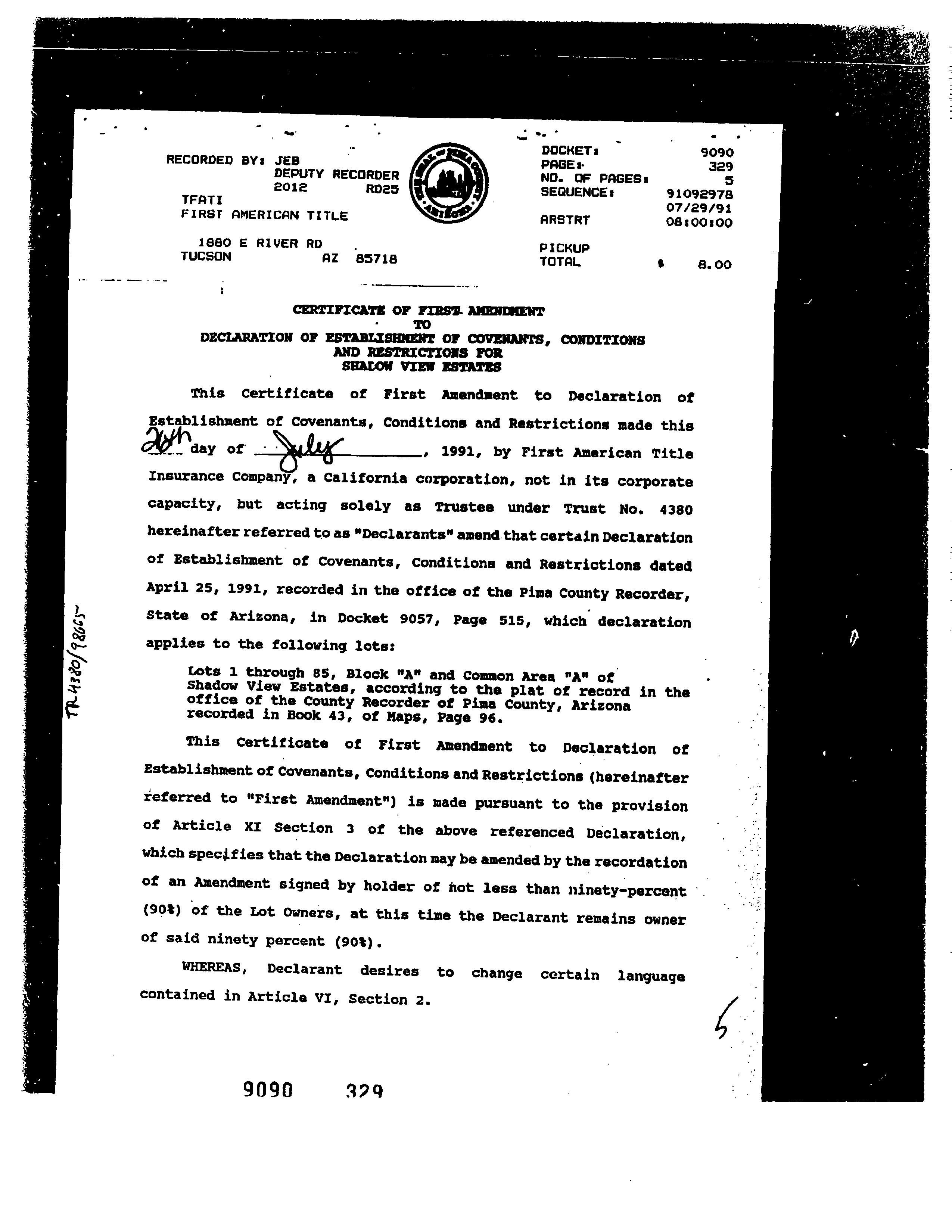 This information is furnished without fee and without benefit of a complete title search. No liability is assumed by First American Title. If it is desired that liability be assumed, you may apply for a policy of title insurance with First American Title Insurance Company.