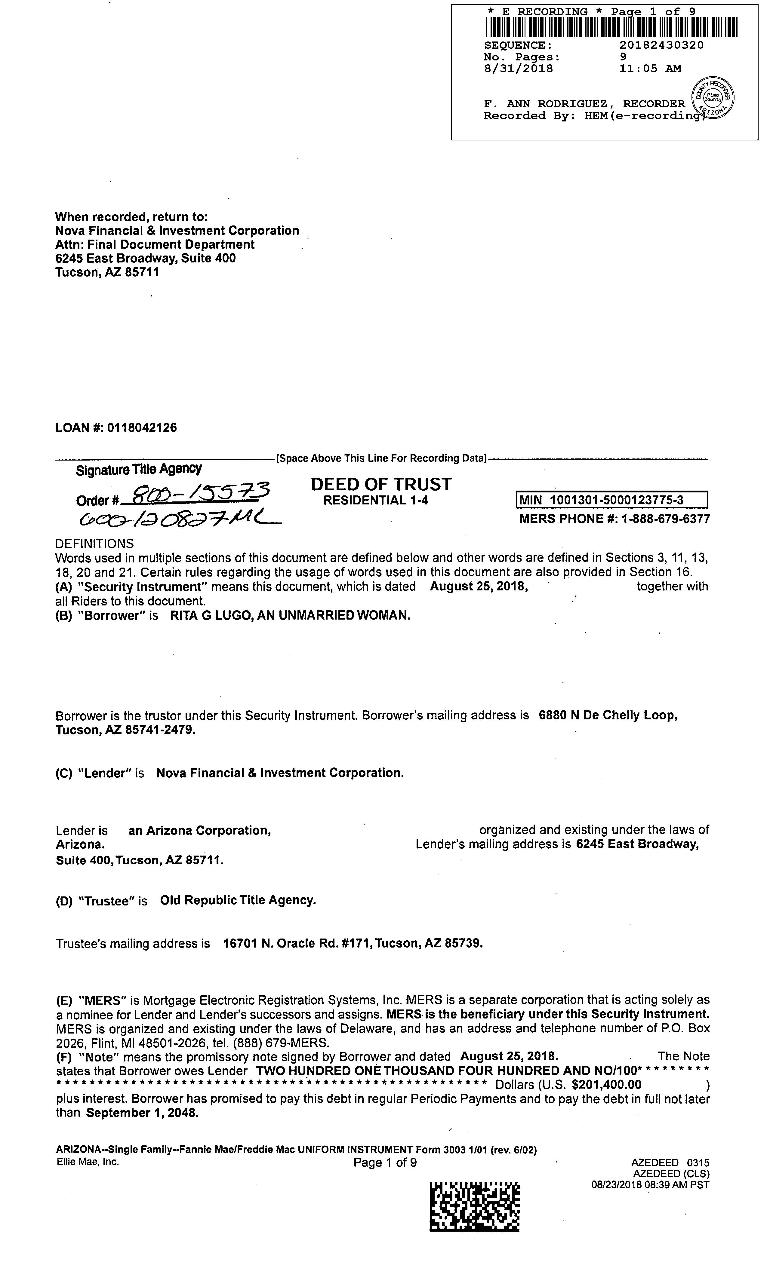 OWNER: LUGO RITA G AFFIDAVIT 2018 2430319 08/31/2018