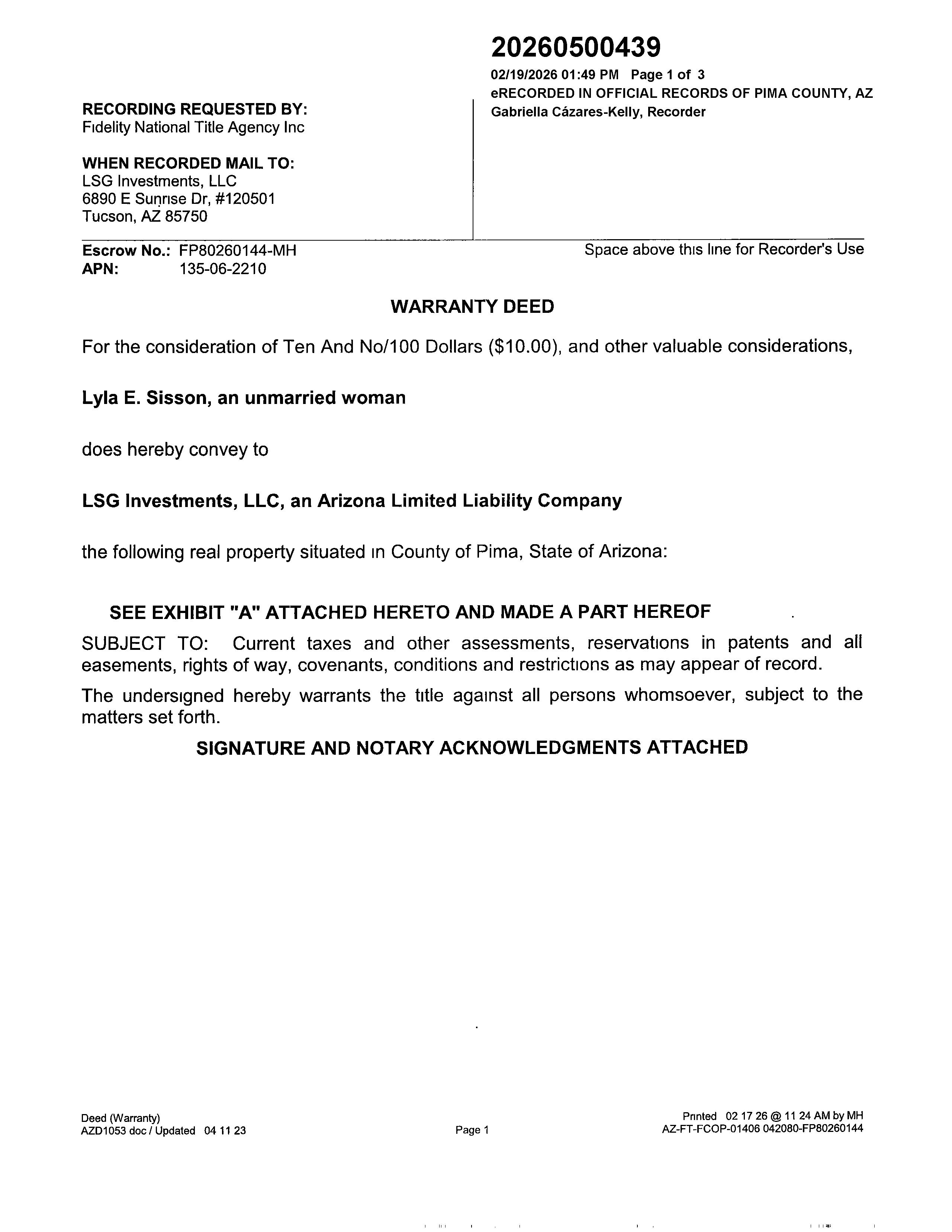 This information is furnished without fee and without benefit of a complete title search. No liability is assumed by First American Title. If it is desired that liability be assumed, you may apply for a policy of title insurance with First American Title Insurance Company.
