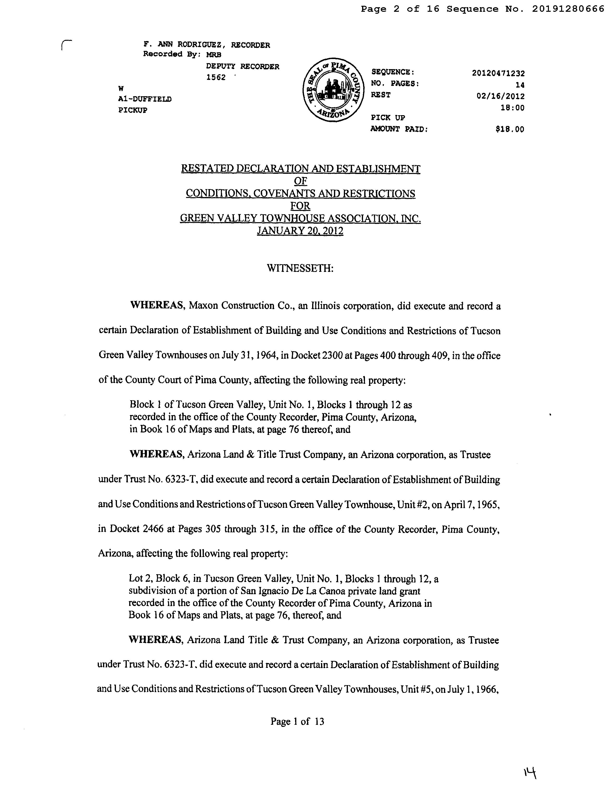 LEGAL: TUCSON GREEN VALLEY UNIT NO 1 N87' S124' W41.40' E559.06' BLK 1 ADJ TO WIDENED ESPERANZA FRONTAGE RD