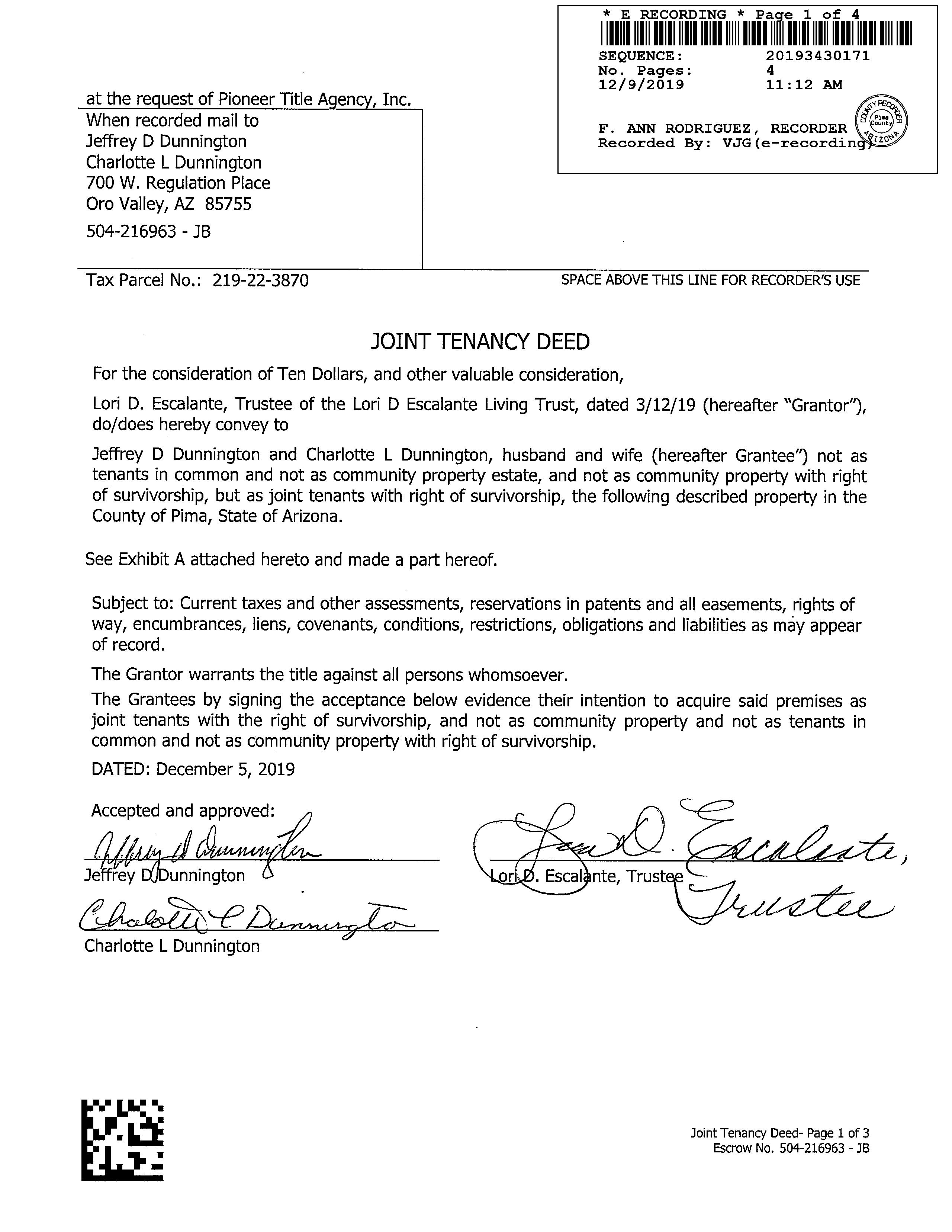 Owner Name: Dunnington Jeffrey D /Dunnington Charlotte L APN / Alternate APN: 219-22-3870 / Deed Type: Joint Tenancy Deed