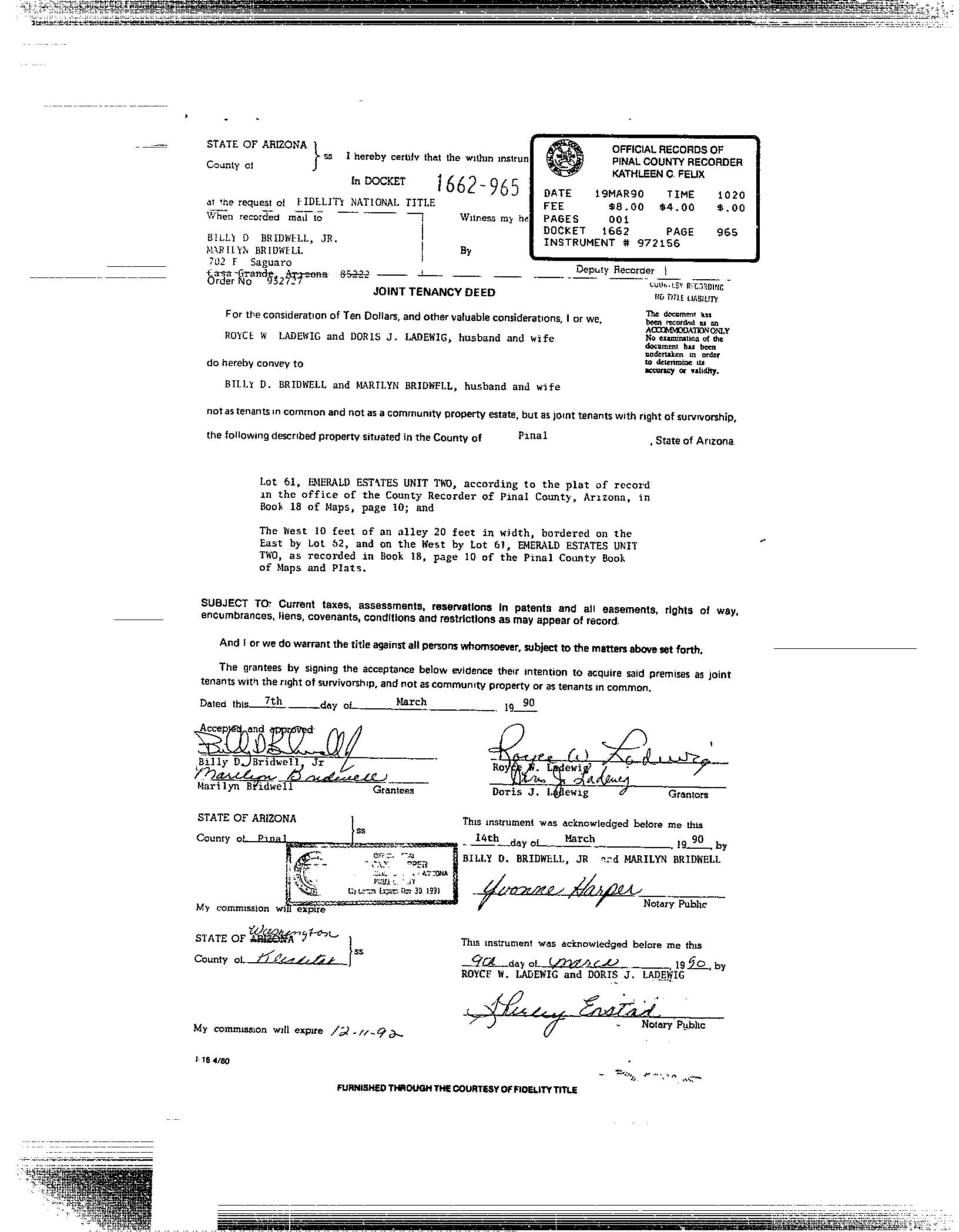 OWNER: BRIDWELL BILLY D & MARILYN 1662 965 03/19/1990