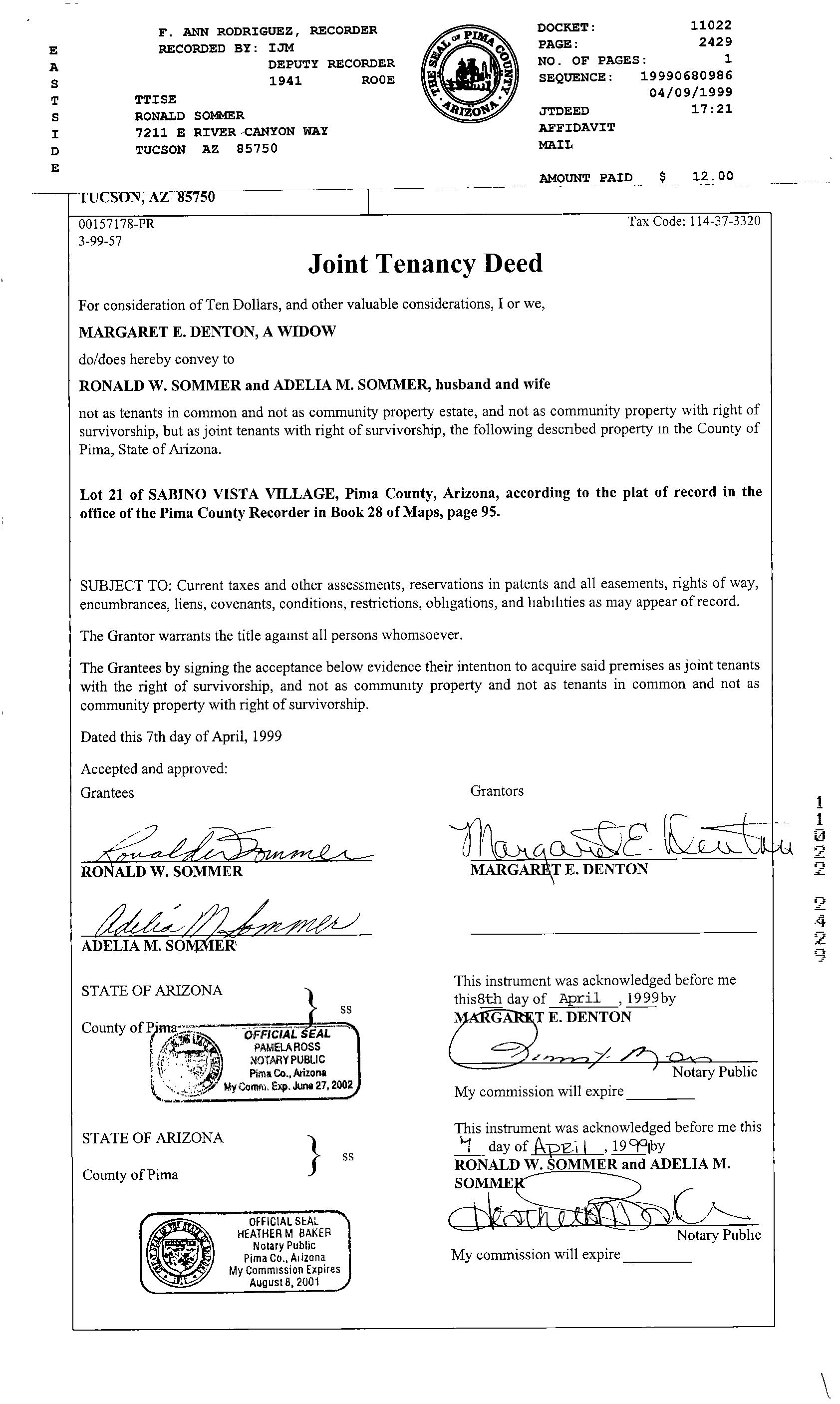 OWNER: SOMMER RONALD W & ADELIA M JT/RS