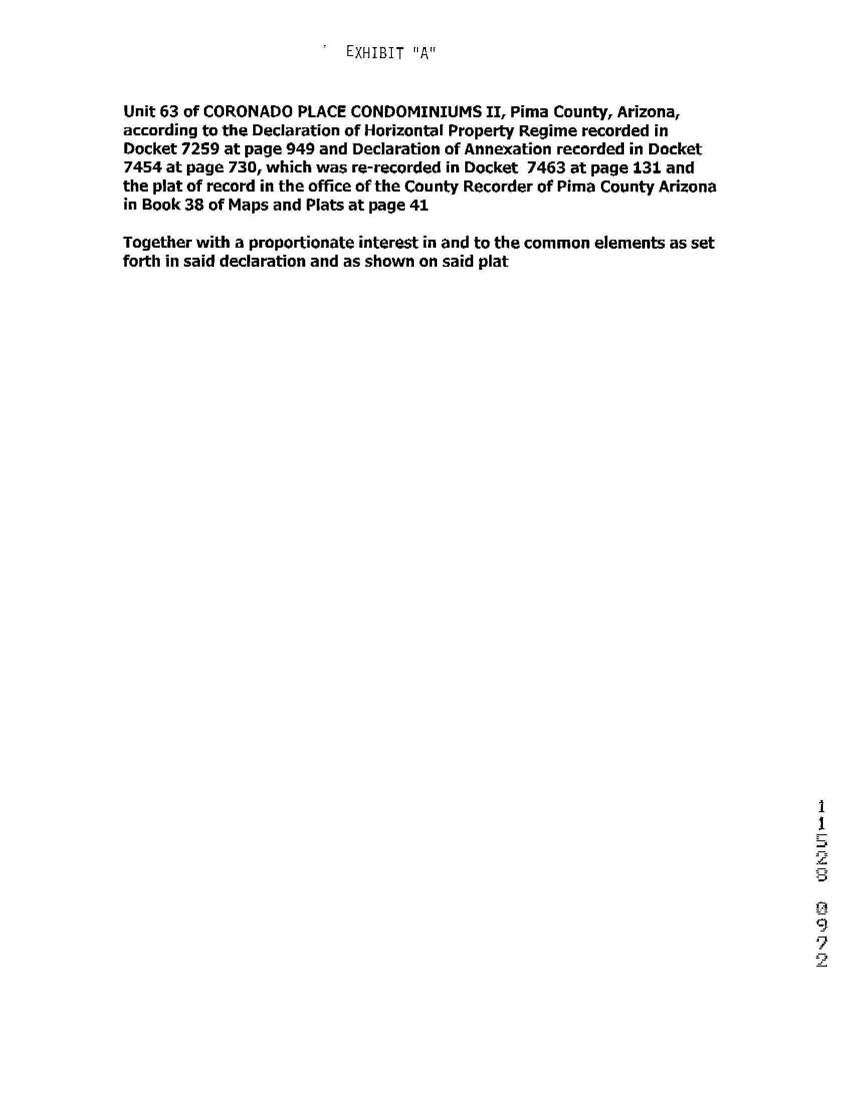 Legal Description : Coronado Place Condominums Ii Unit 63 Resub Ptn Coronado Pl Condominums & Ptn Lot 3 Tanque Verde Terr Ptn Nw4 Ne4 Sec 5-14-15