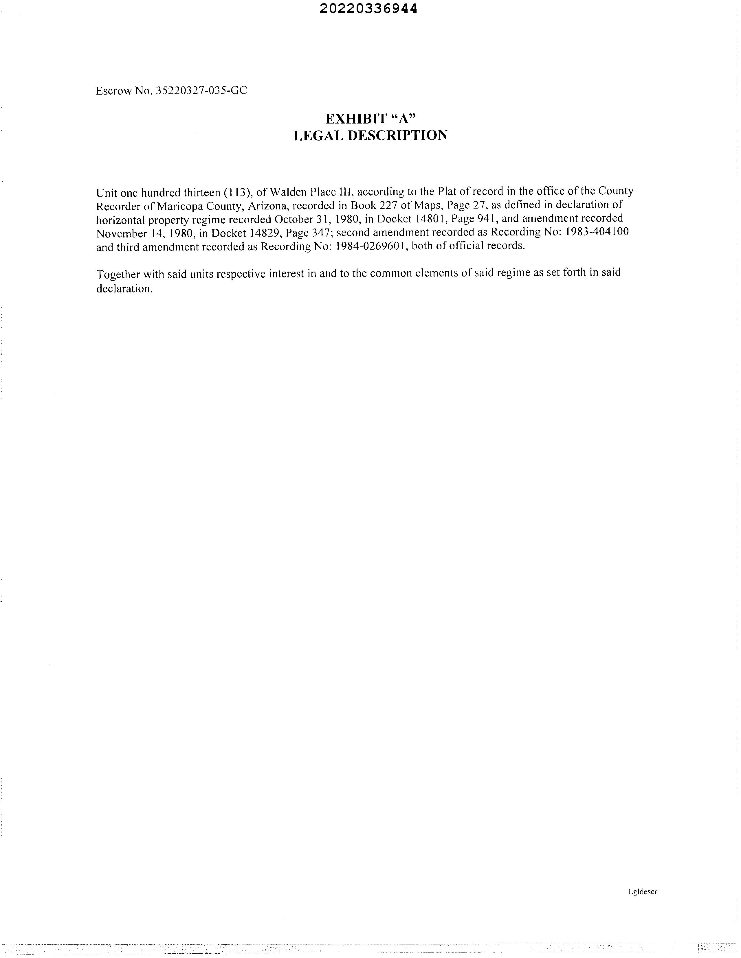 O Location Information Legal Description : Lot 113 Walden Place 3 Mcr 227-27 Unit 113 Tog W/an Undiv 1-116 Int In The Common Elements County : Maricopa, Az Subdivision : Walden Place 3 Census Tract / Block : 2170.01 / 6 Map Reference : 22727 Township-Range- Sect : 02N-04E-14 School District : Scottsdale 48 Legal Lot : 113 Munic/Township : Scottsdale APN : 173-03-510 Neighbor Code : 05-006