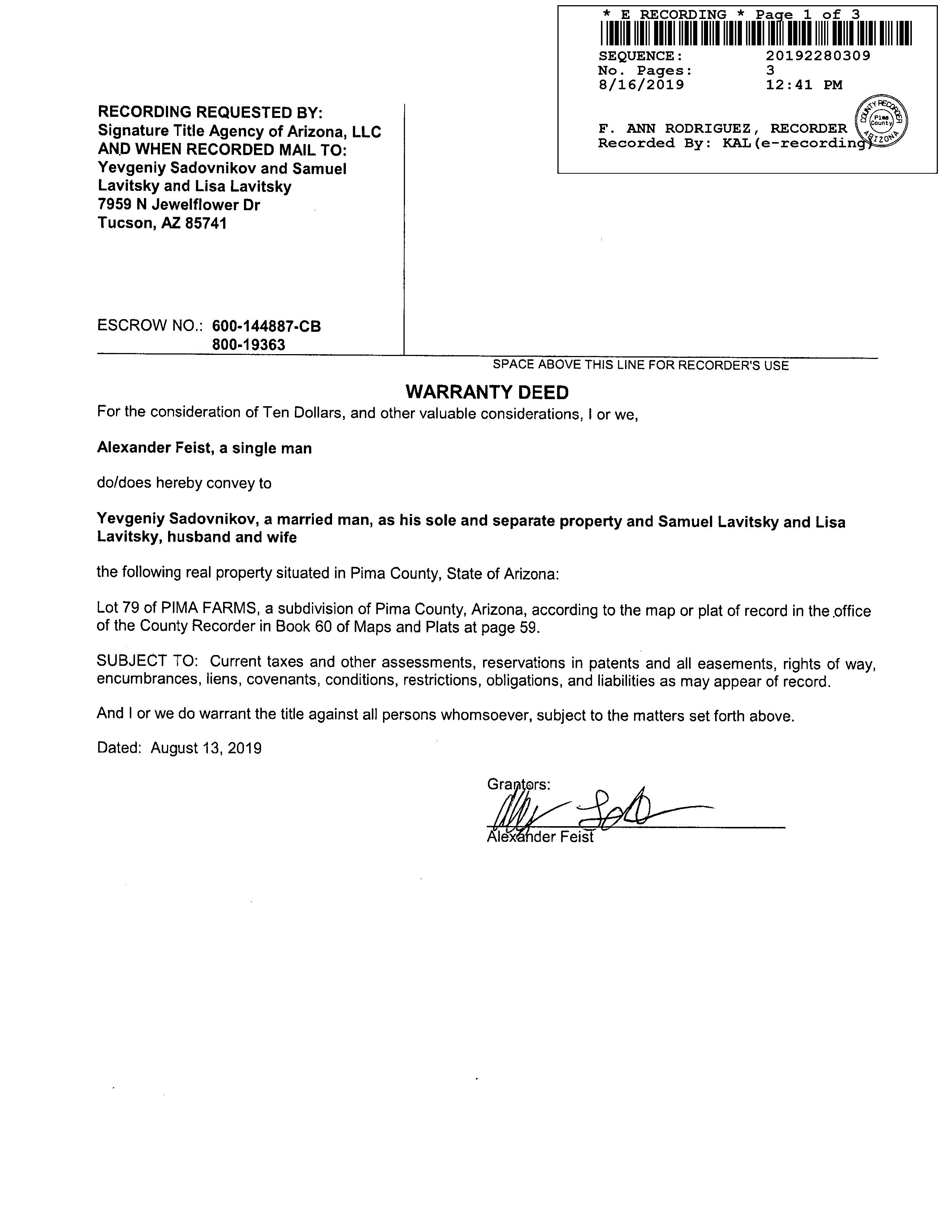 Title Company : Signature Title Agcy/az Llc Seller Name : Feist Alexander