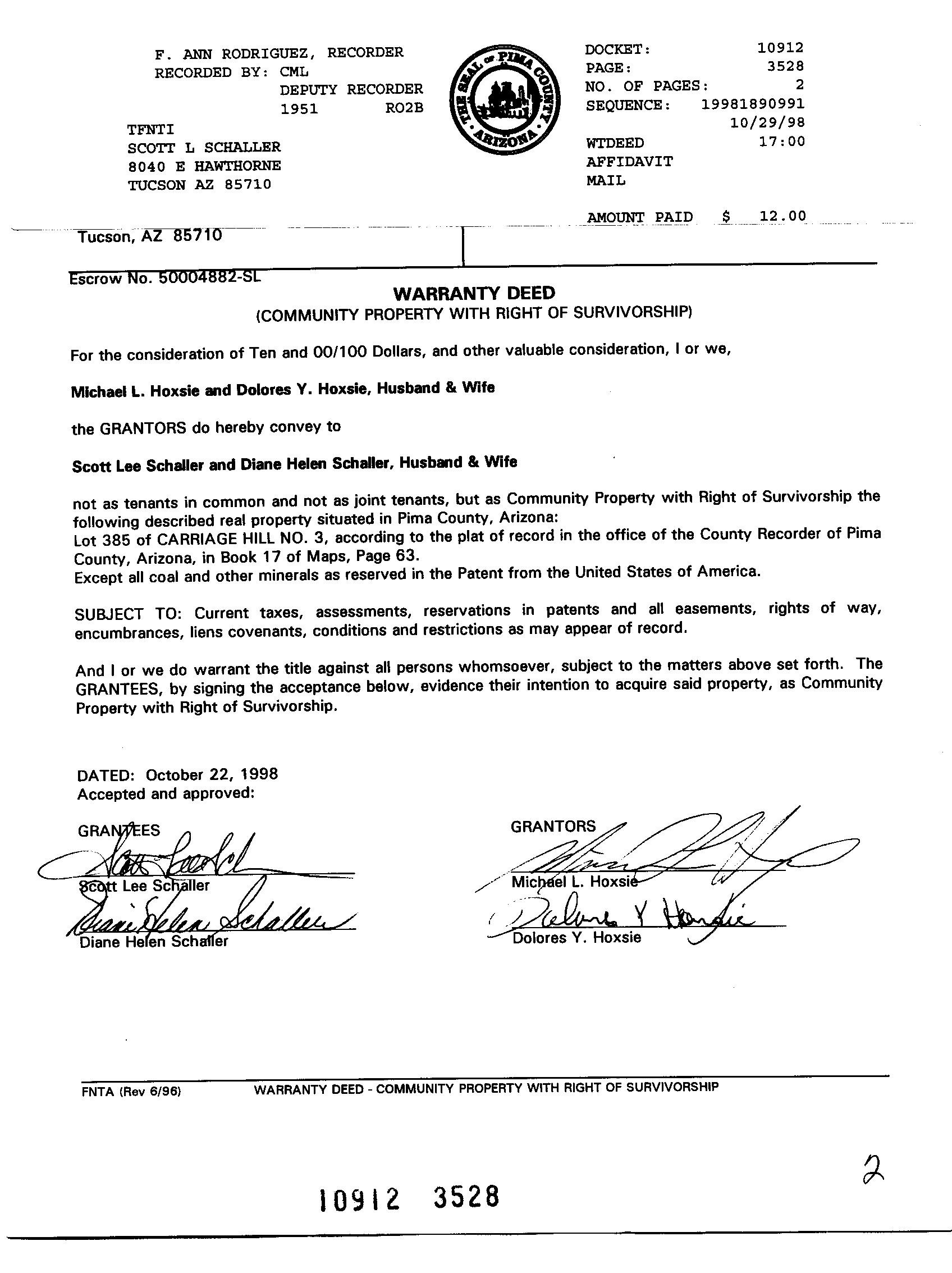 OWNER: SCHALLER SCOTT LEE & DIANE HELEN CP/RS 10912 3528 10/29/1998