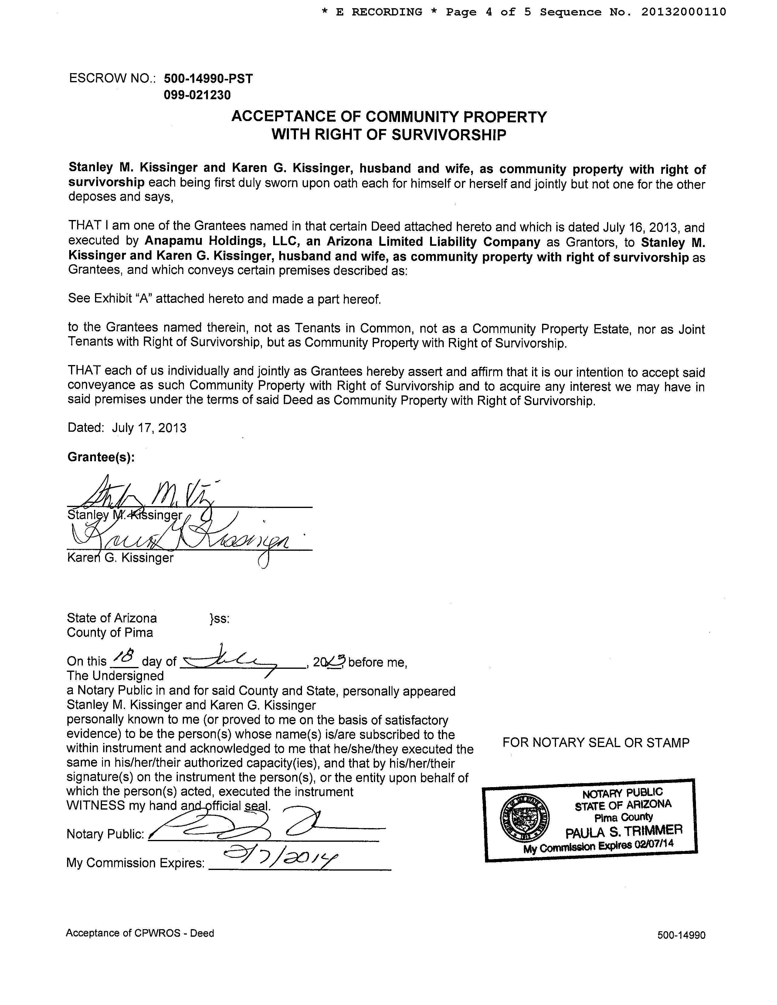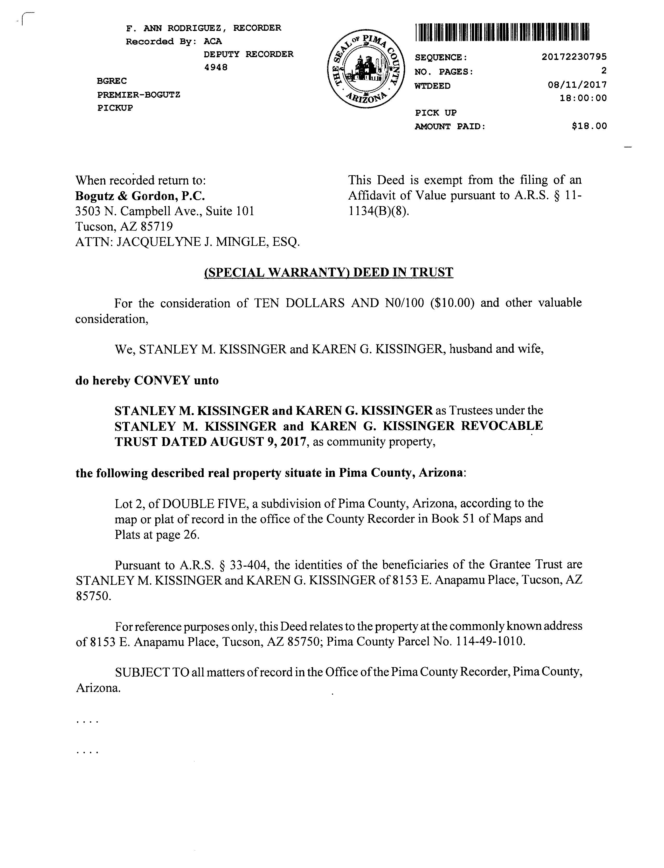 Owner Name : Kissinger Stanley M / Kissinger Karen G Mailing Address : 8153 E Anapamu Pl, Tucson AZ 85750-2934 C032