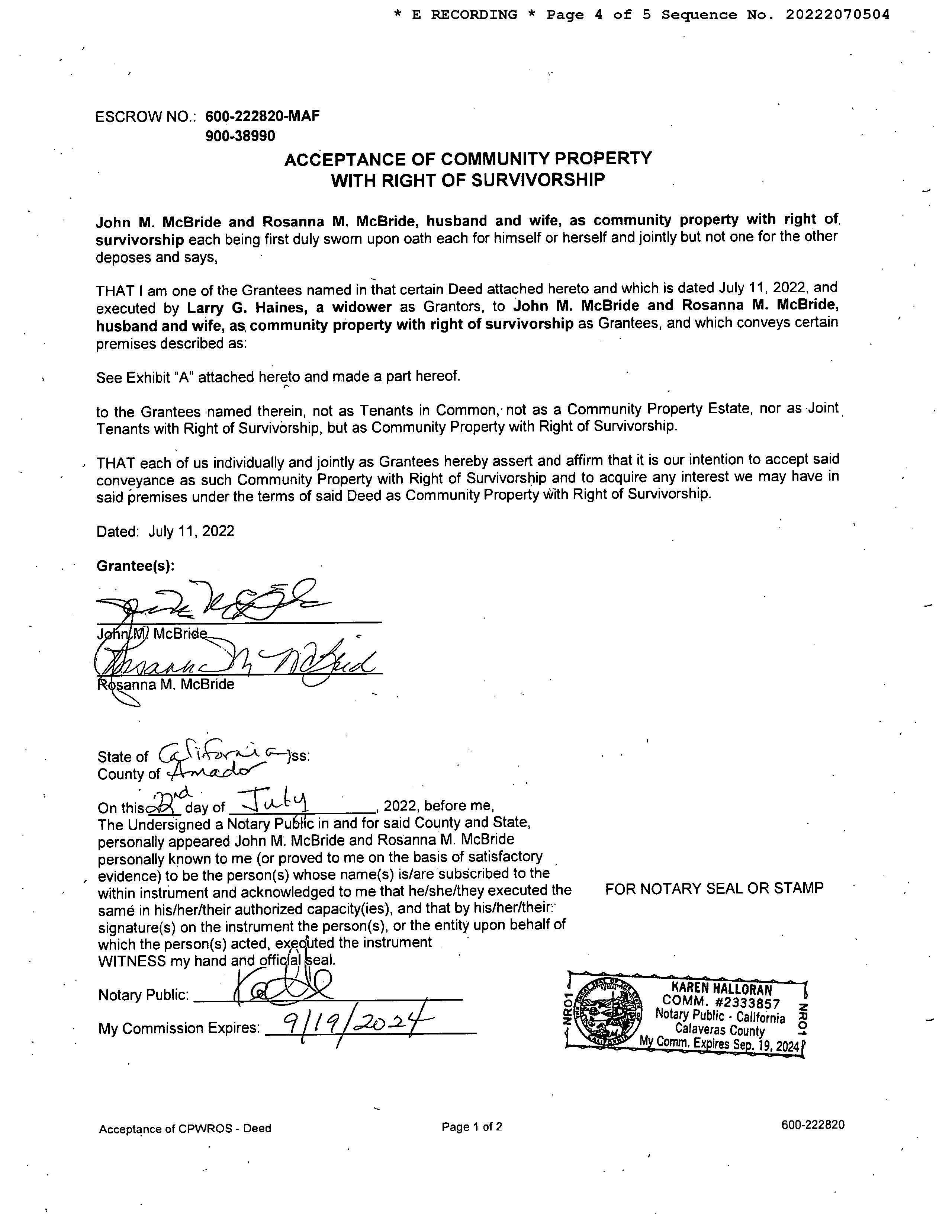 OWNER: MCBRIDE JOHN & ROSANNA AFFIDAVIT 2022 2070504 07/26/2022
