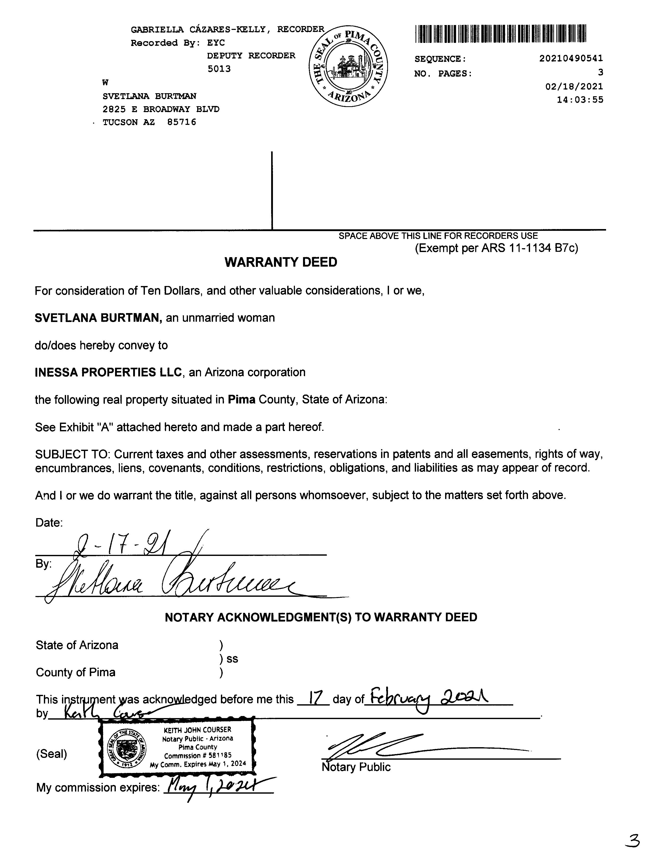 Owner Name: Inessa Properties Llc / APN / Alternate APN: 114-18-004E / Deed Type: Warranty Deed