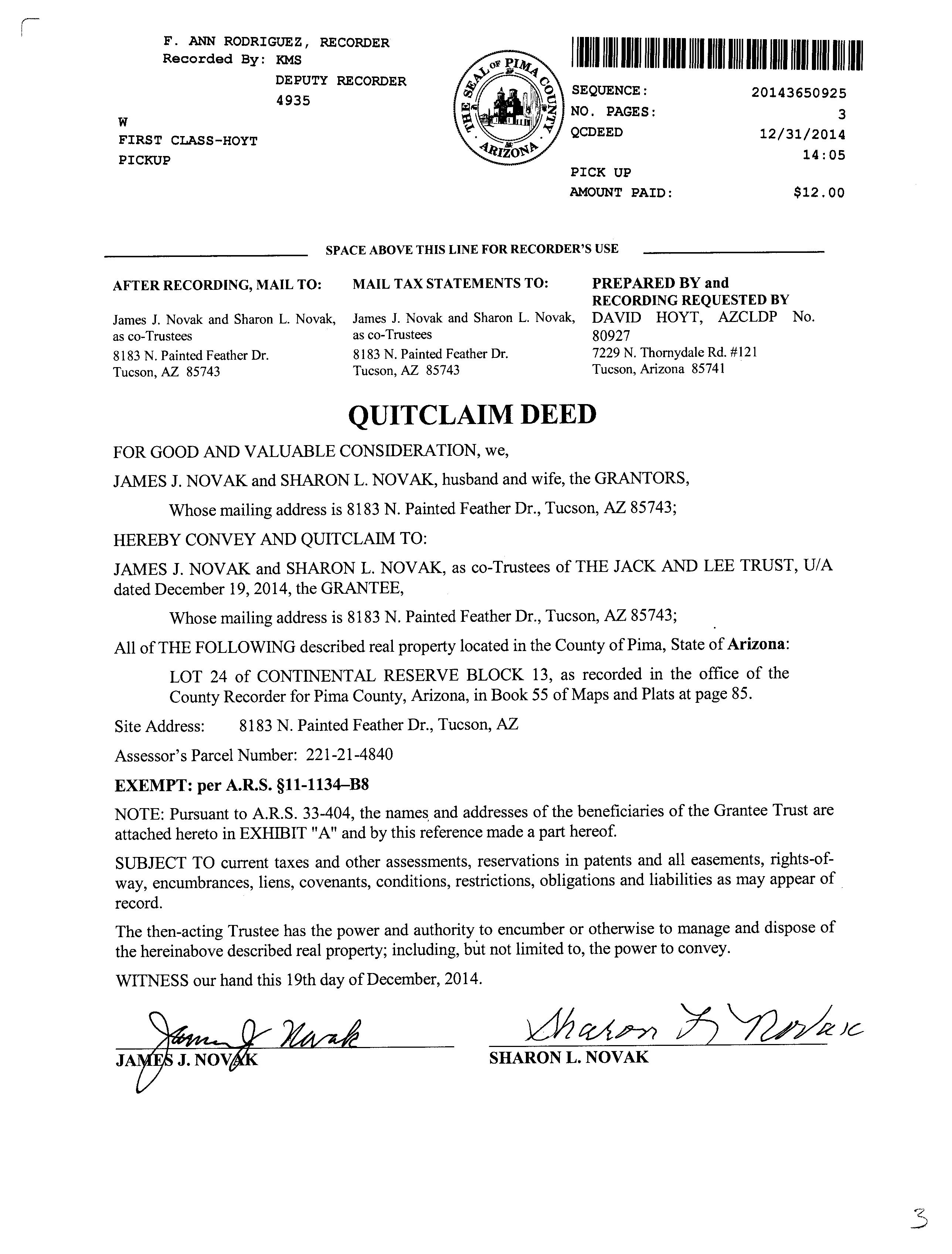 Recording/Sale Date : 12/31/2014 / 12/19/2014 Deed Type : Quit Claim Deed