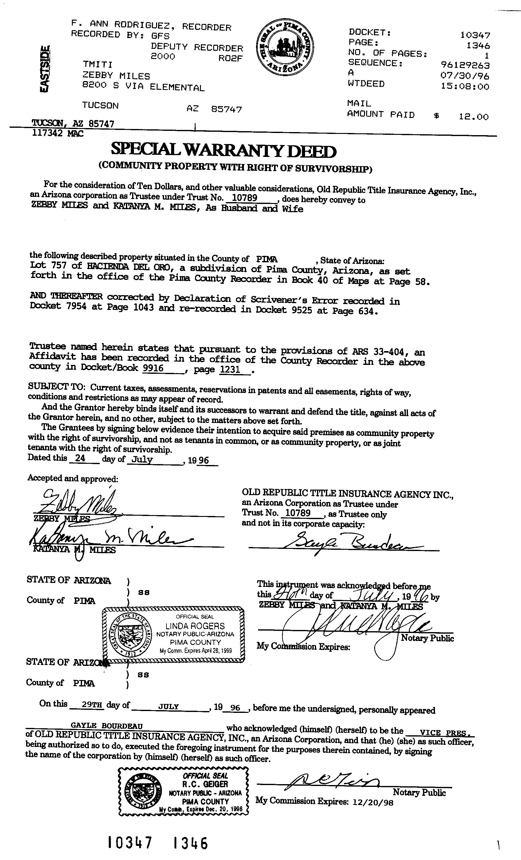 RecordingDate 07/30/1996 Vesting CommunityProperty(MaritalCommunity)