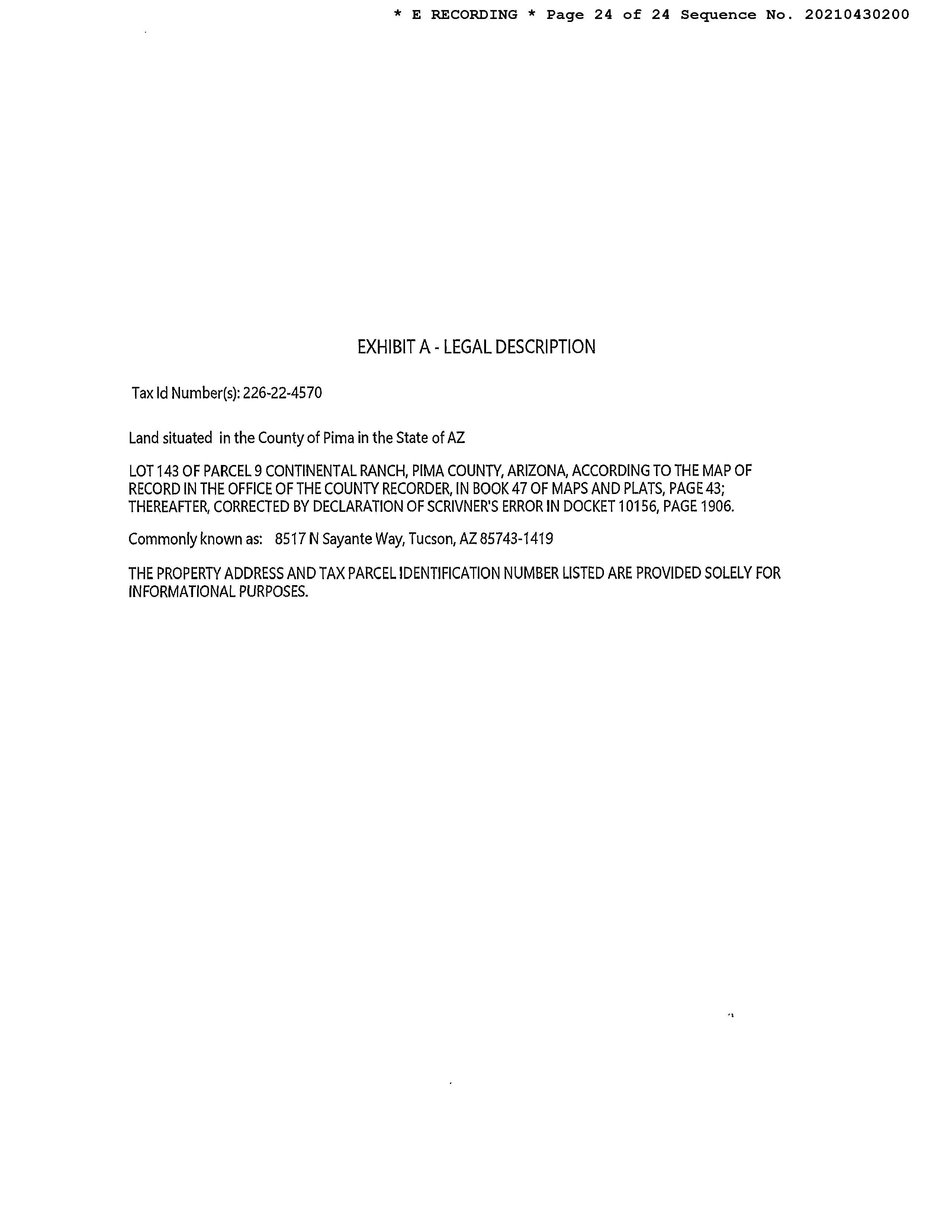 Mailing Address : 8517 N Sayante Way, Tucson AZ 85743-1419 R055