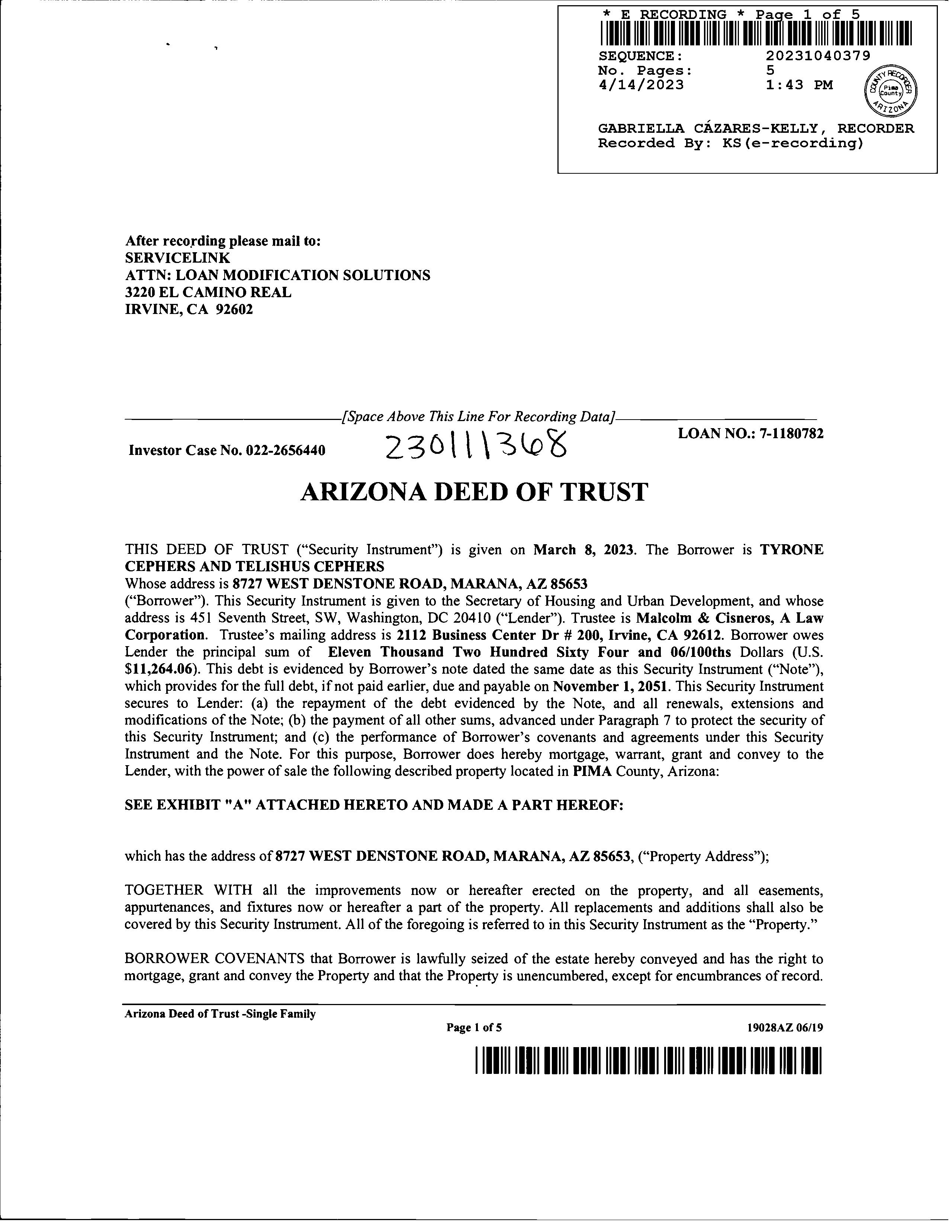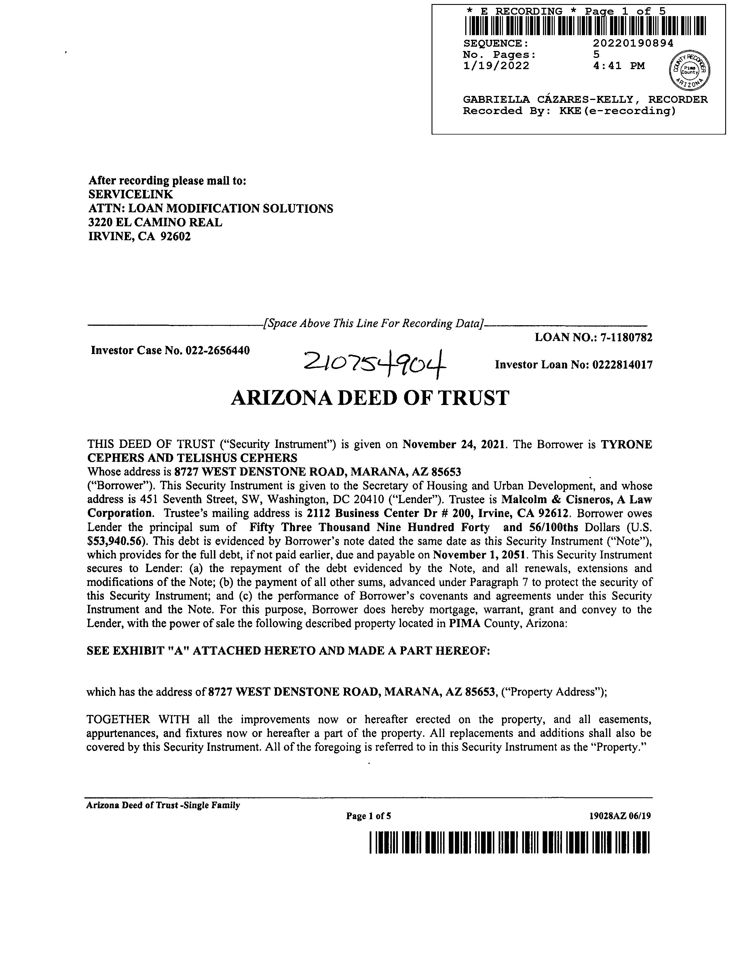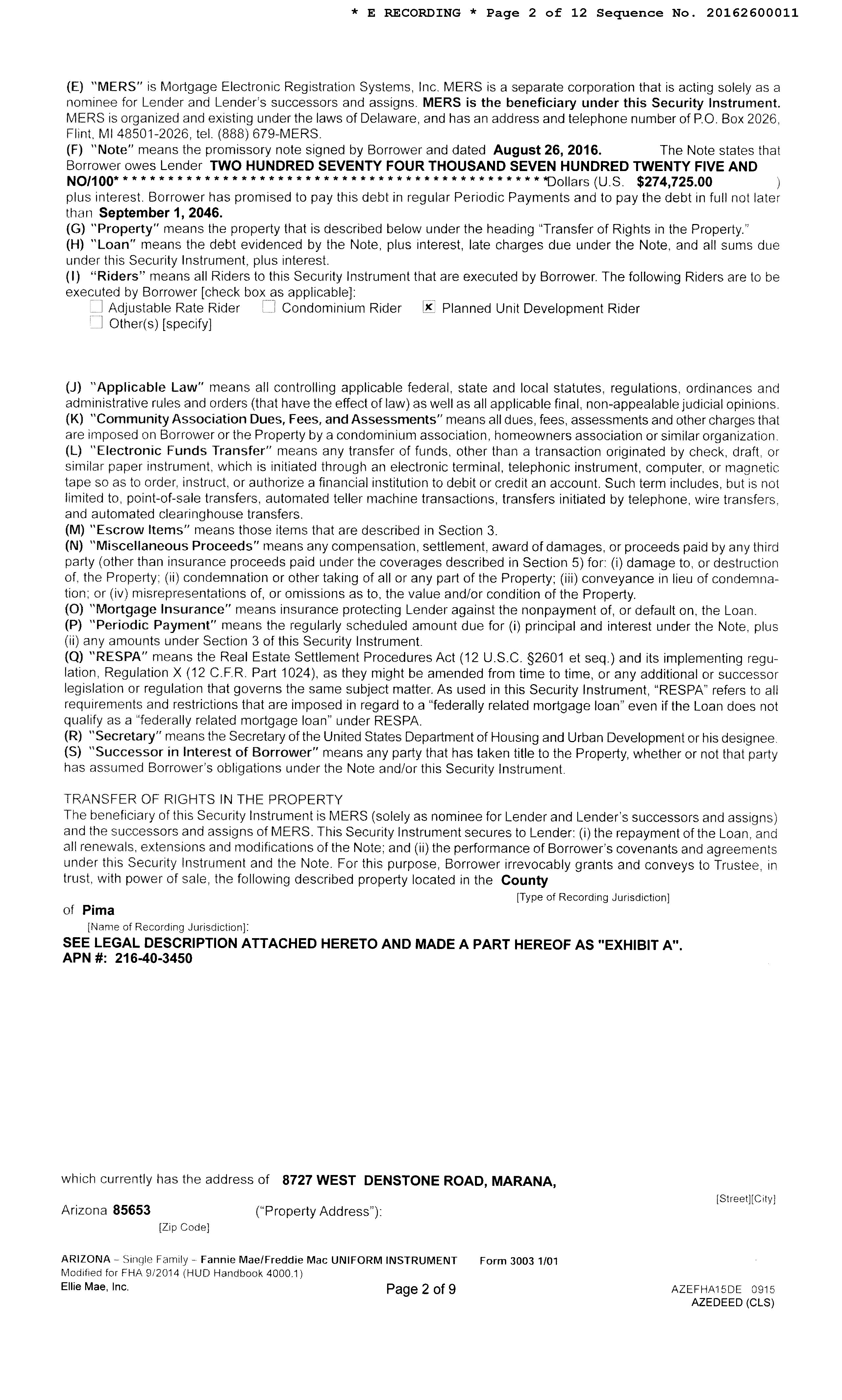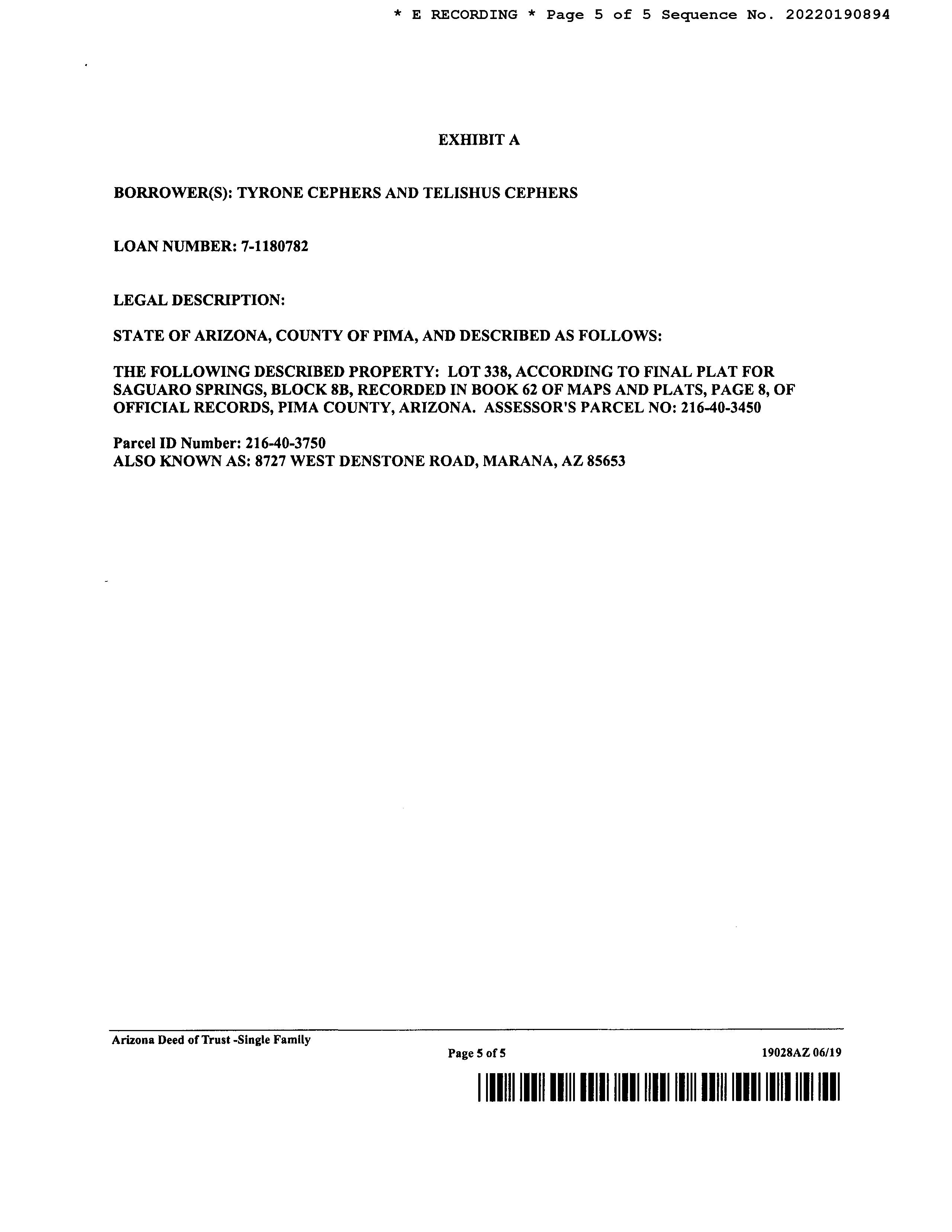 Mailing Address : 8727 W Denstone Rd, Marana AZ 85653-8885 H019