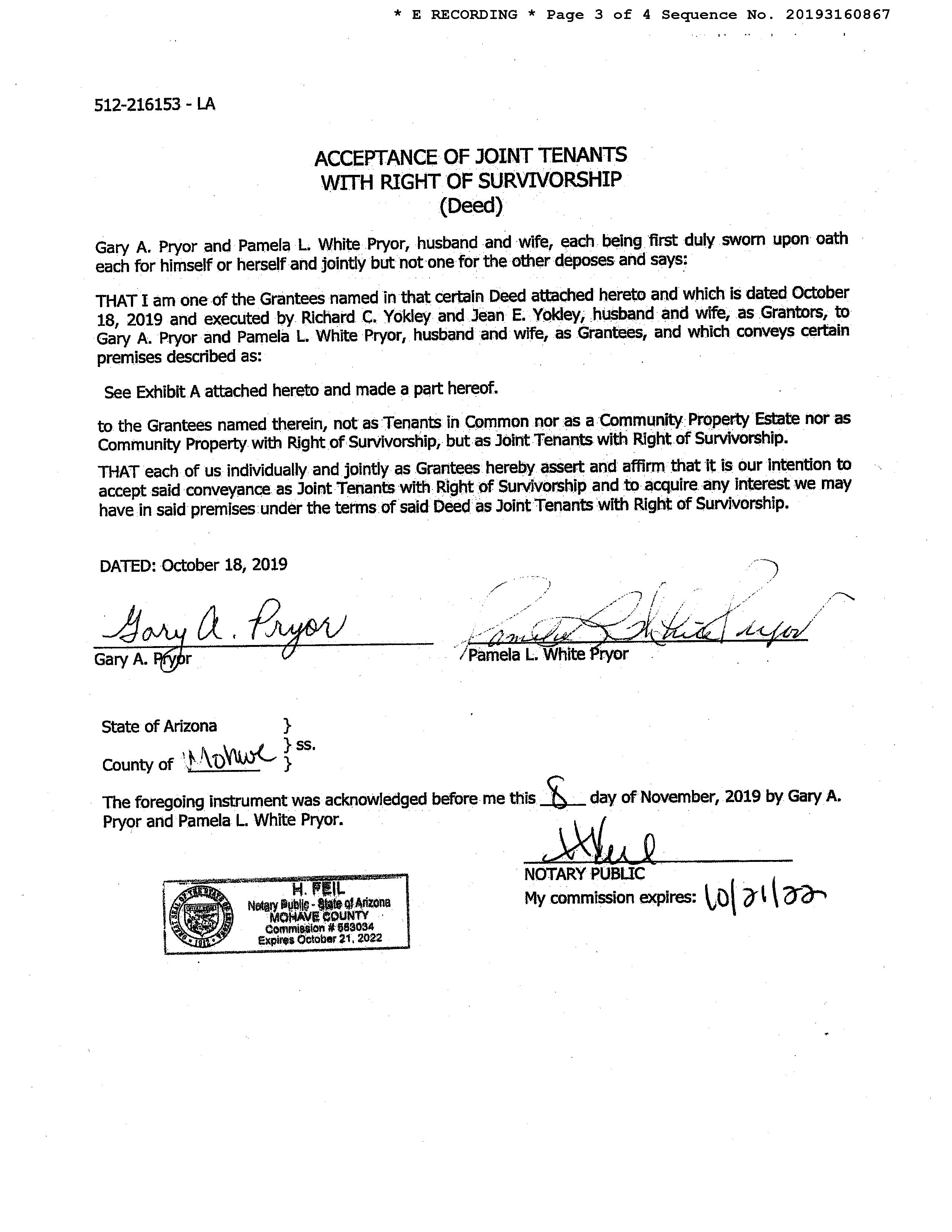 OWNER: PRYOR GARY A & PAMELA L WHI AFFIDAVIT 2019 3160867 11/12/2019