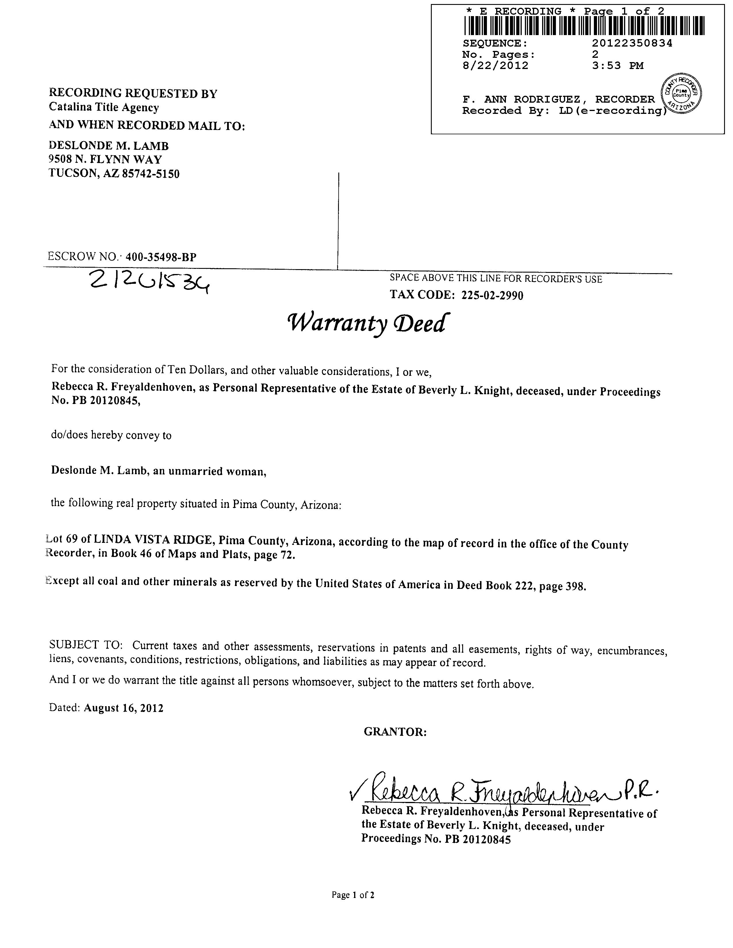 2012 2350834 WD KNIGHT BEVERLY L 11/29/1999 125,000 11182 3022 WD ECCLES KIM A 07/14/1998 115,574 10837 2124 SD FIDELITY NATIONAL T10887
