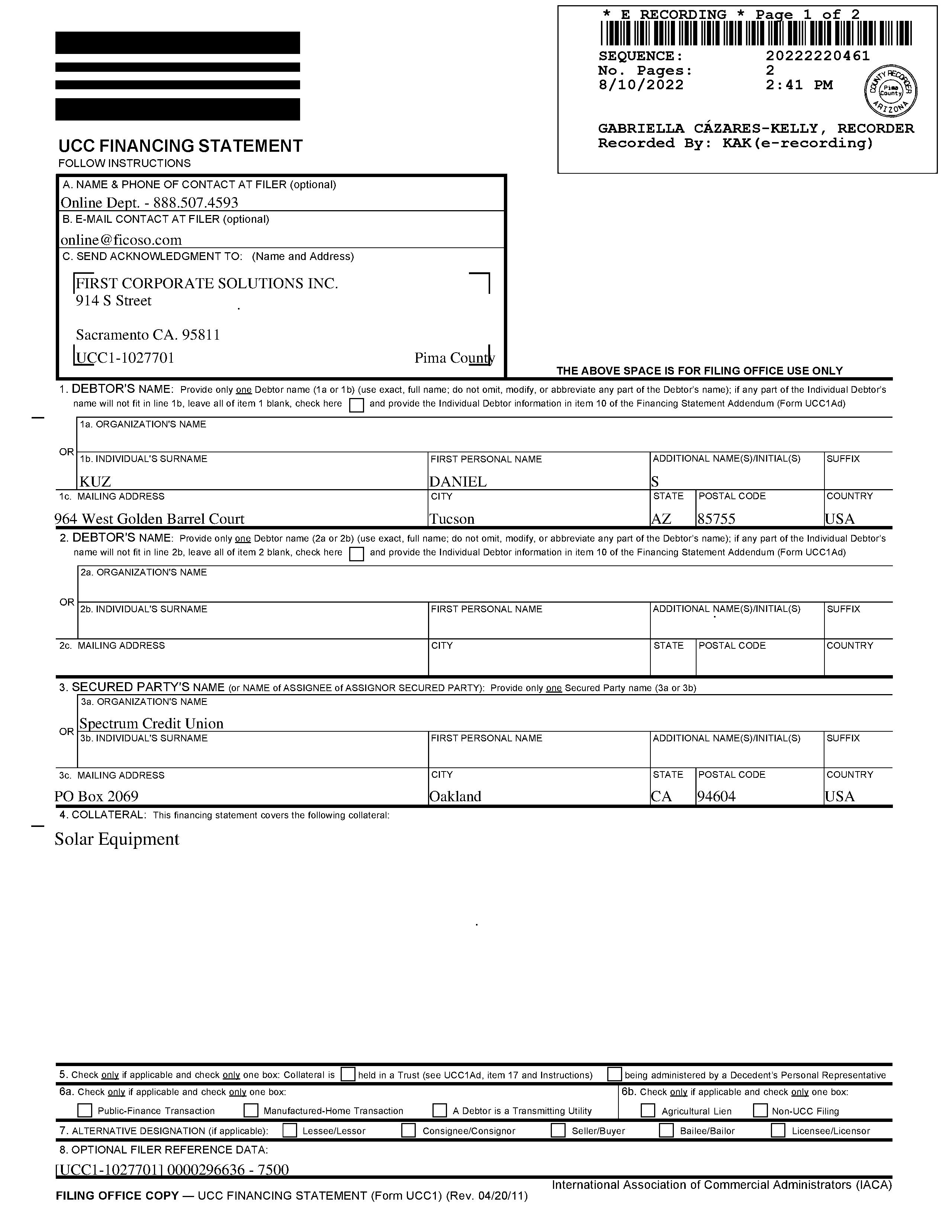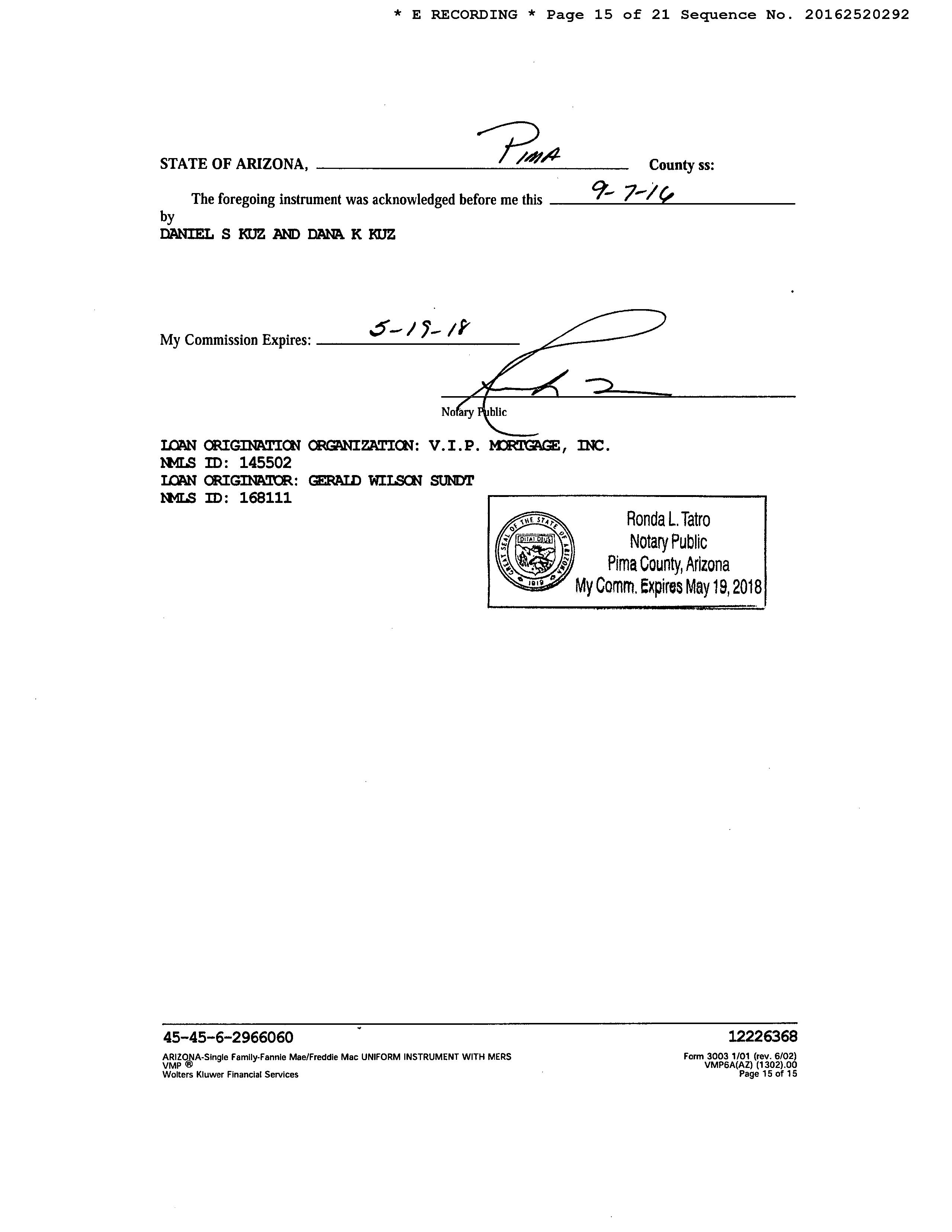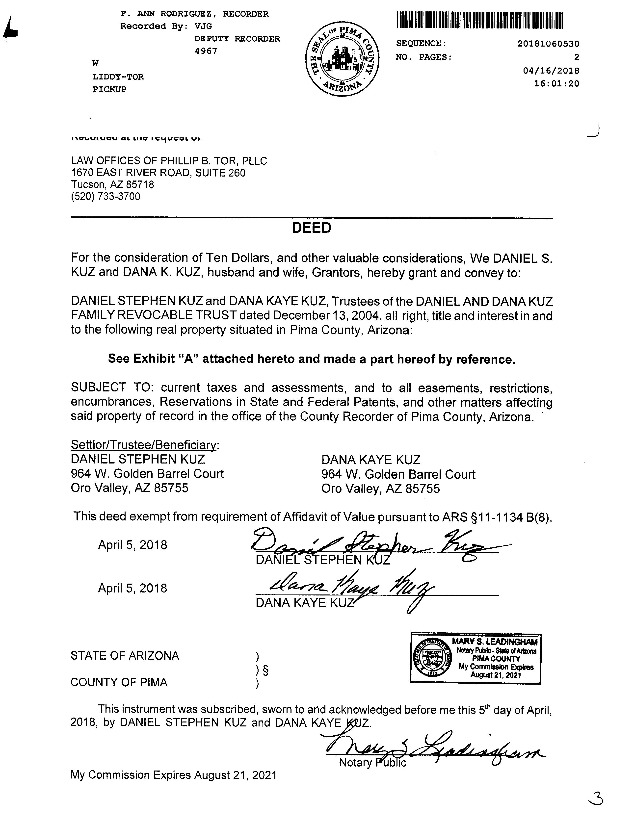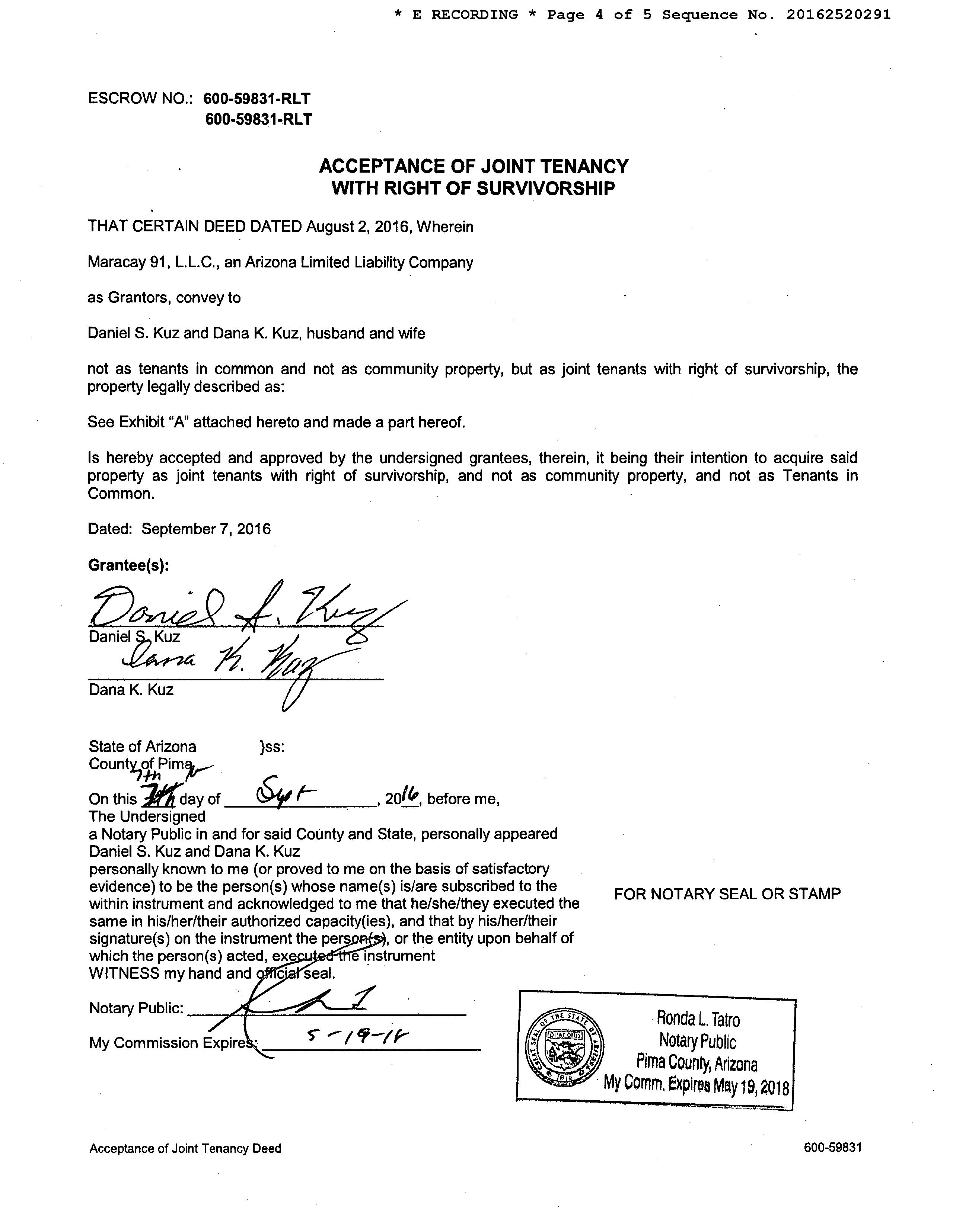 OWNER: KUZ DANIEL S/DANA K AFFIDAVIT 2016 2520291 09/08/2016