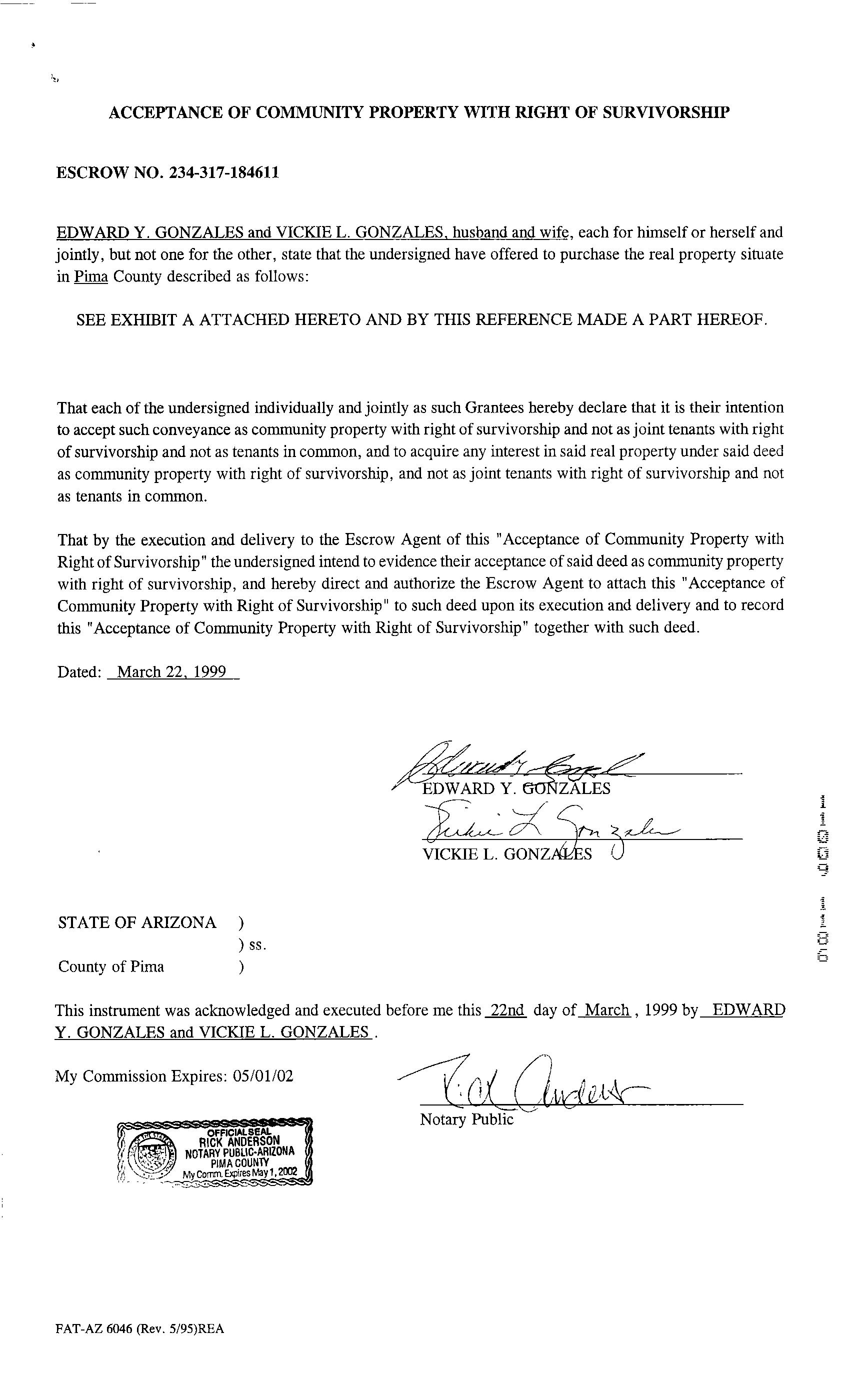 OWNER: GONZALES EDWARD Y & VICKIE L CP/RS 11009 1185 03/23/1999