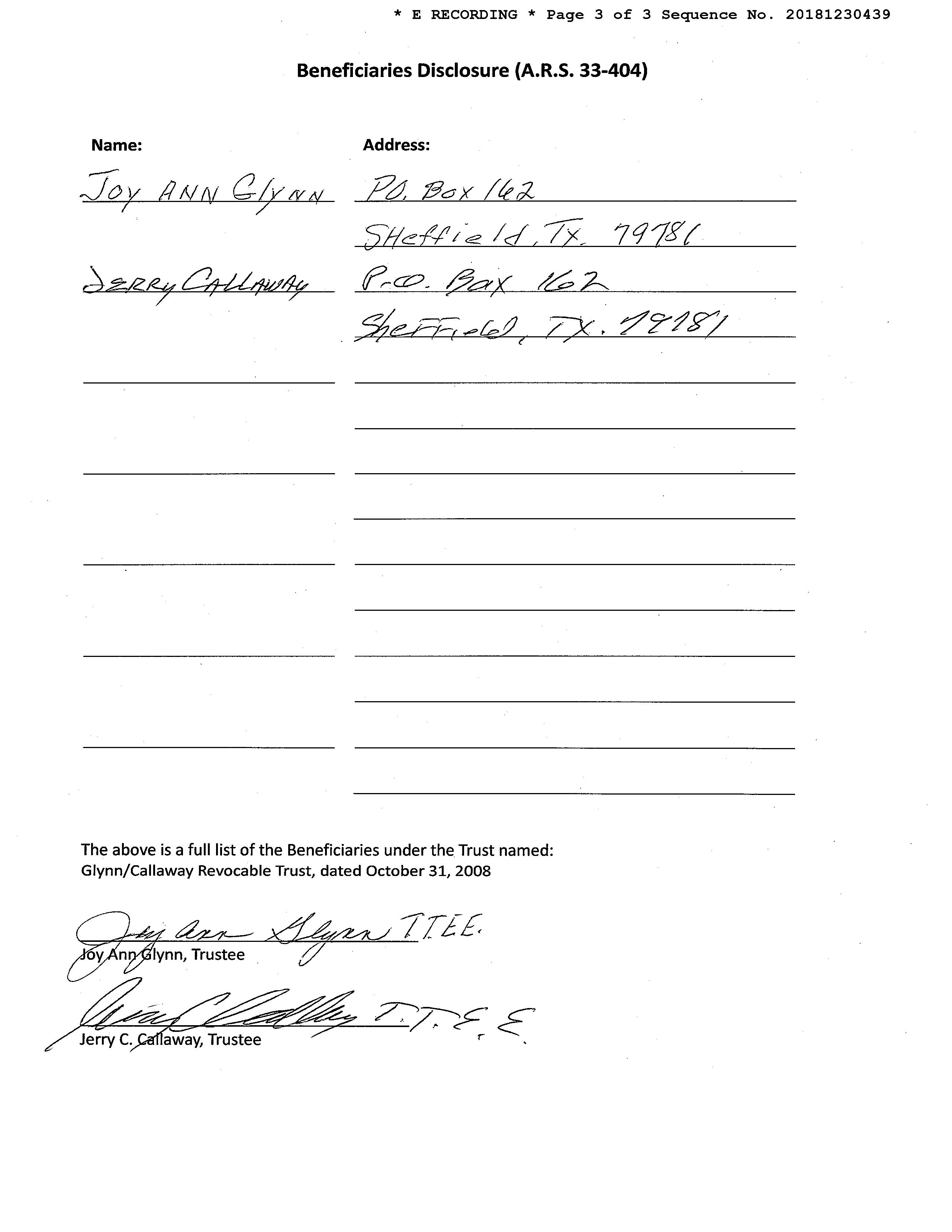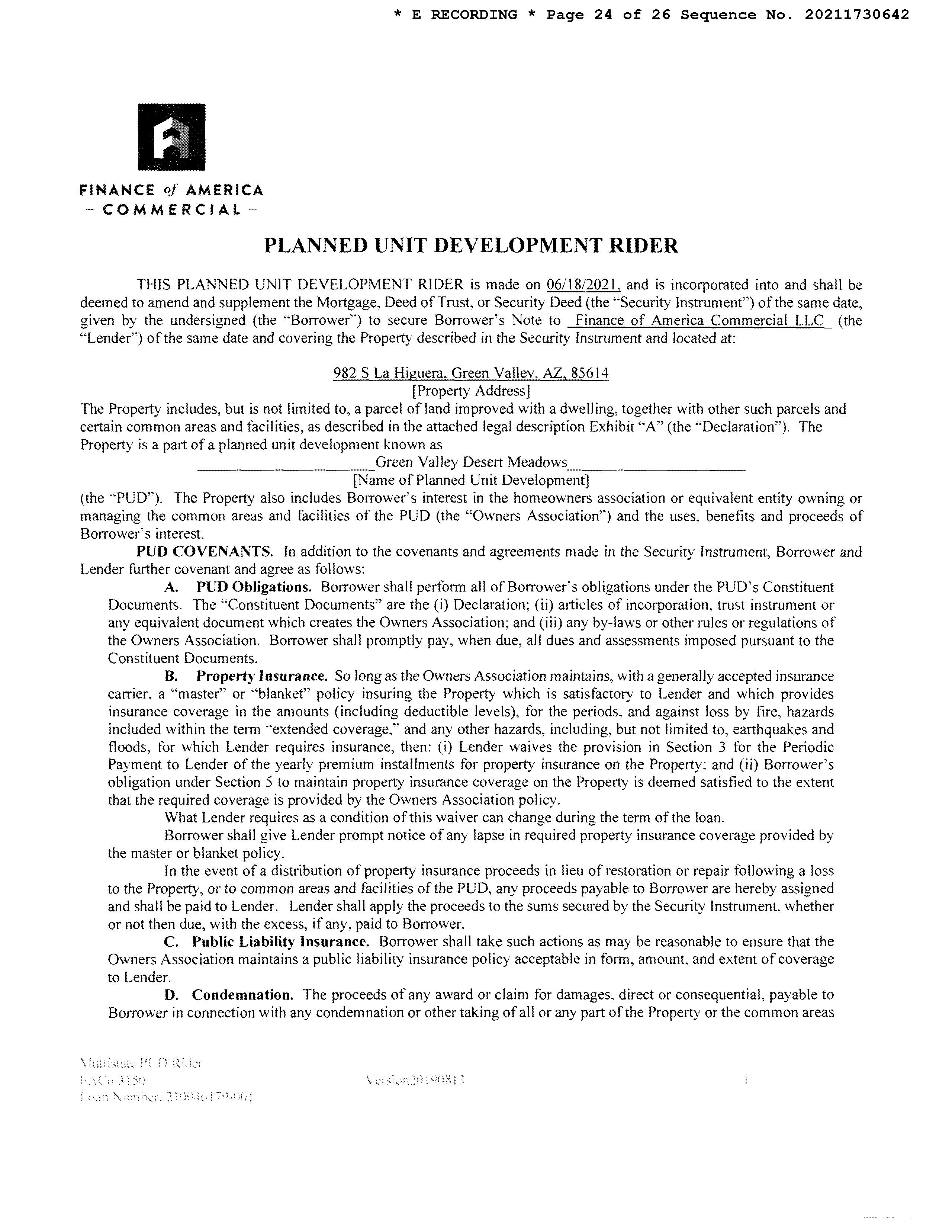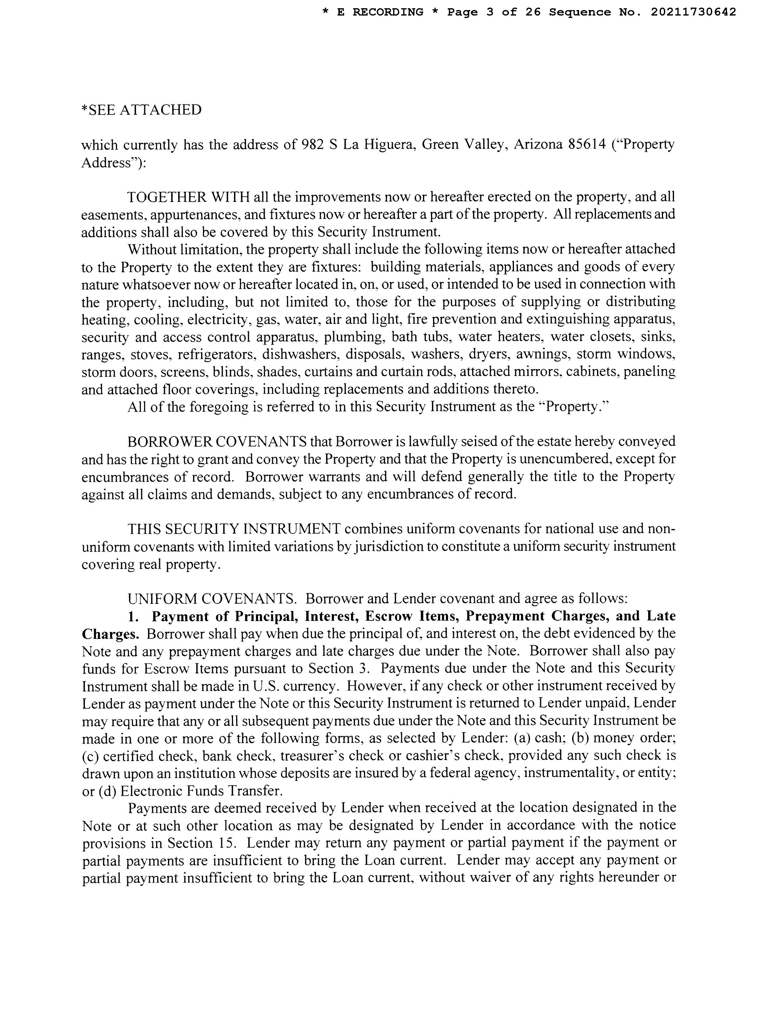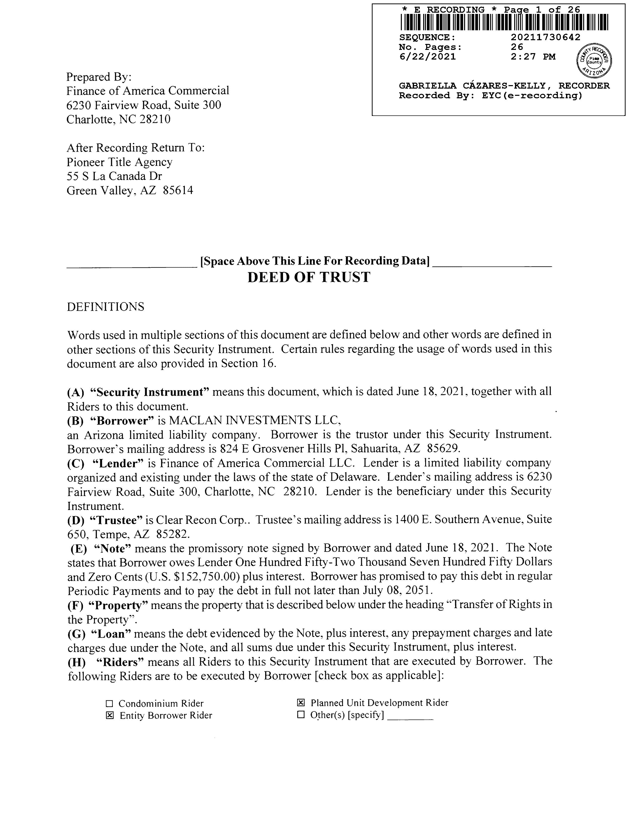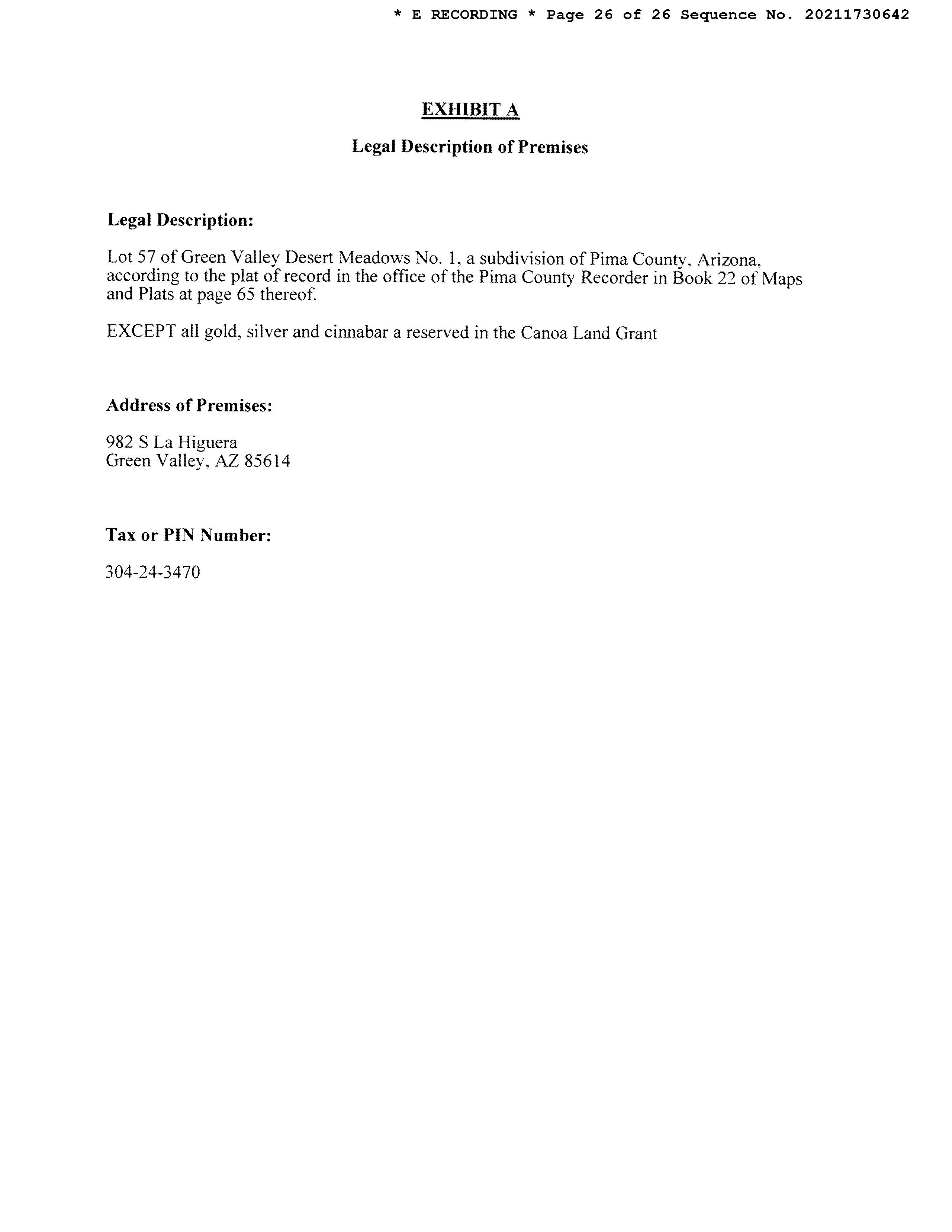 Property Description: A PARCEL OF LAND LOCATED IN THE STATE OF AZ, COUNTY OF PIMA, WITH A SITUS ADDRESS OF 982 S LA HIGUERA, GREEN VALLEY AZ 85614-2117 C073 CURRENTLY OWNED BY MACLAN INVESTMENTS LLC HAVING A TAX ASSESSOR NUMBER OF 304-24-3470 AND BEING THE SAME PROPERTY MORE FULLY DESCRIBED AS GREEN VALLEY DESERT MEADOWS NO 1 LOT 57 AND DESCRIBED IN DOCUMENT NUMBER 1230439 DATED 5/1/2018 AND RECORDED 5/3/2018
