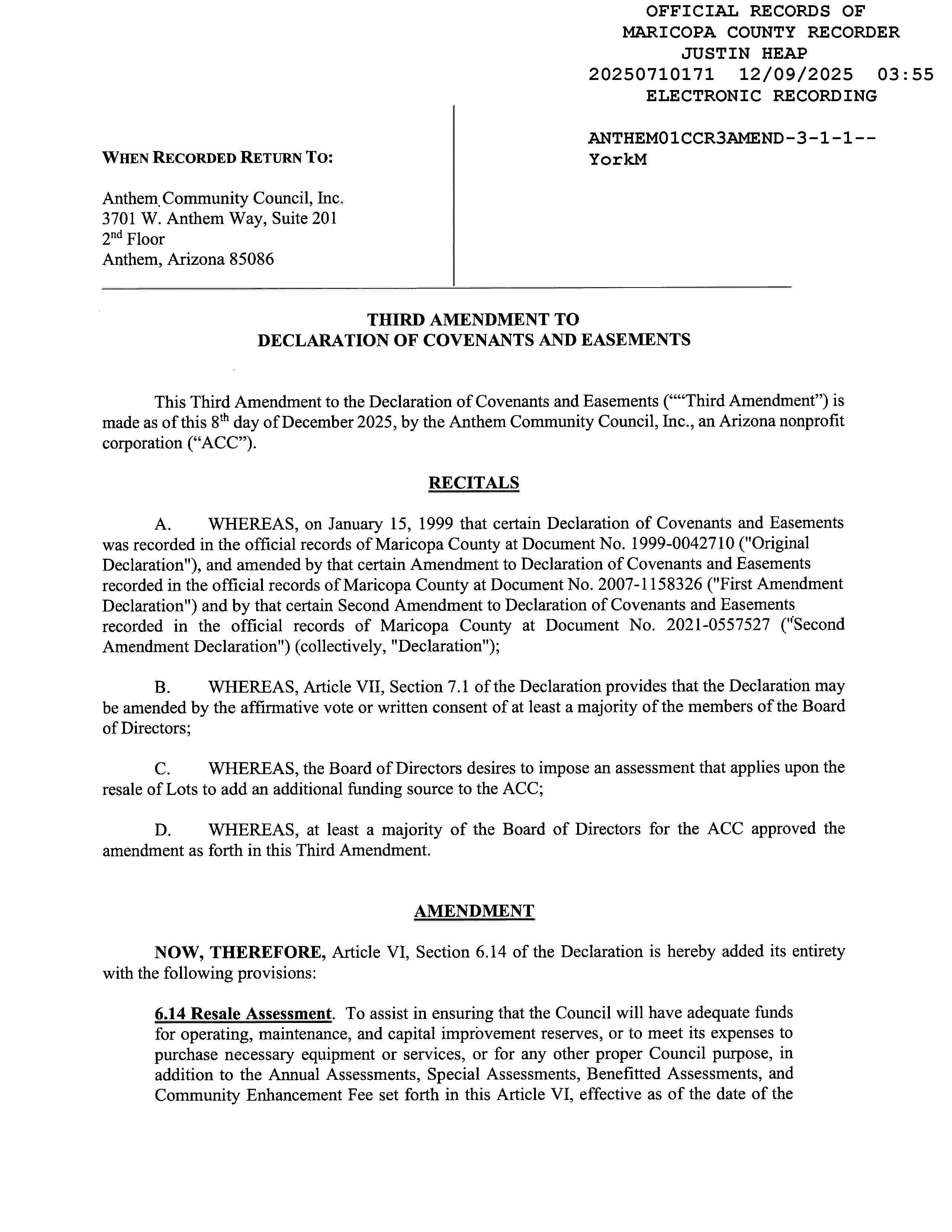 “Community Covenant”: The Declaration of Covenants and Easements for Anthem which governs the entire Anthem community and, among other things, establishes the Council's authority to oversee community-wide affairs and provide community services and facilities.
