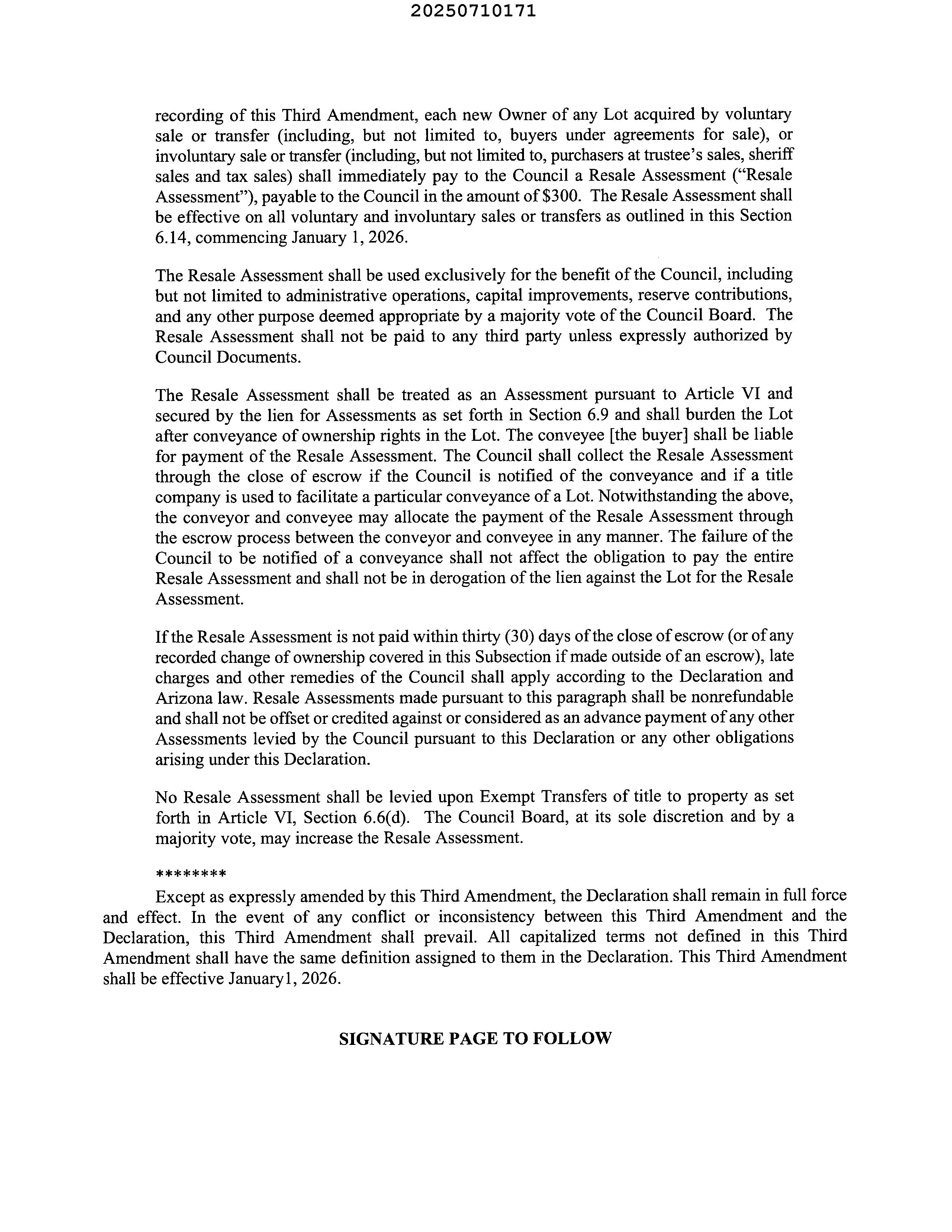 No amendment may remove, revoke, or modify any right or privilege of Declarant without the written consent of Declarant (or the assignee of such right or privilege). Additionally, no amendment may remove, revoke, or modify any right or privilege of the Council without the Council's written consent.