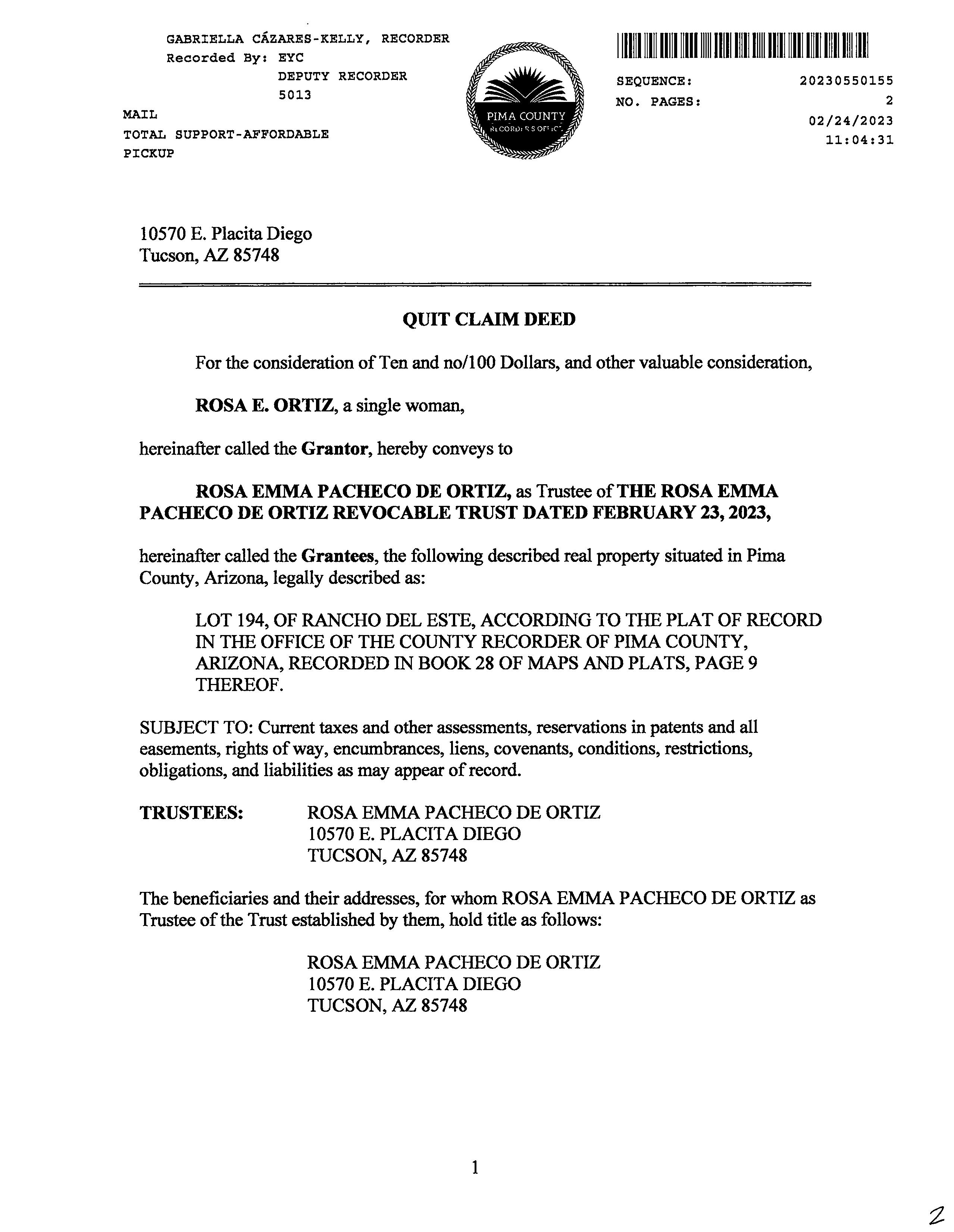 Mailing Address : 10570 E Placita Diego, Tucson AZ 85748-7718 C003
