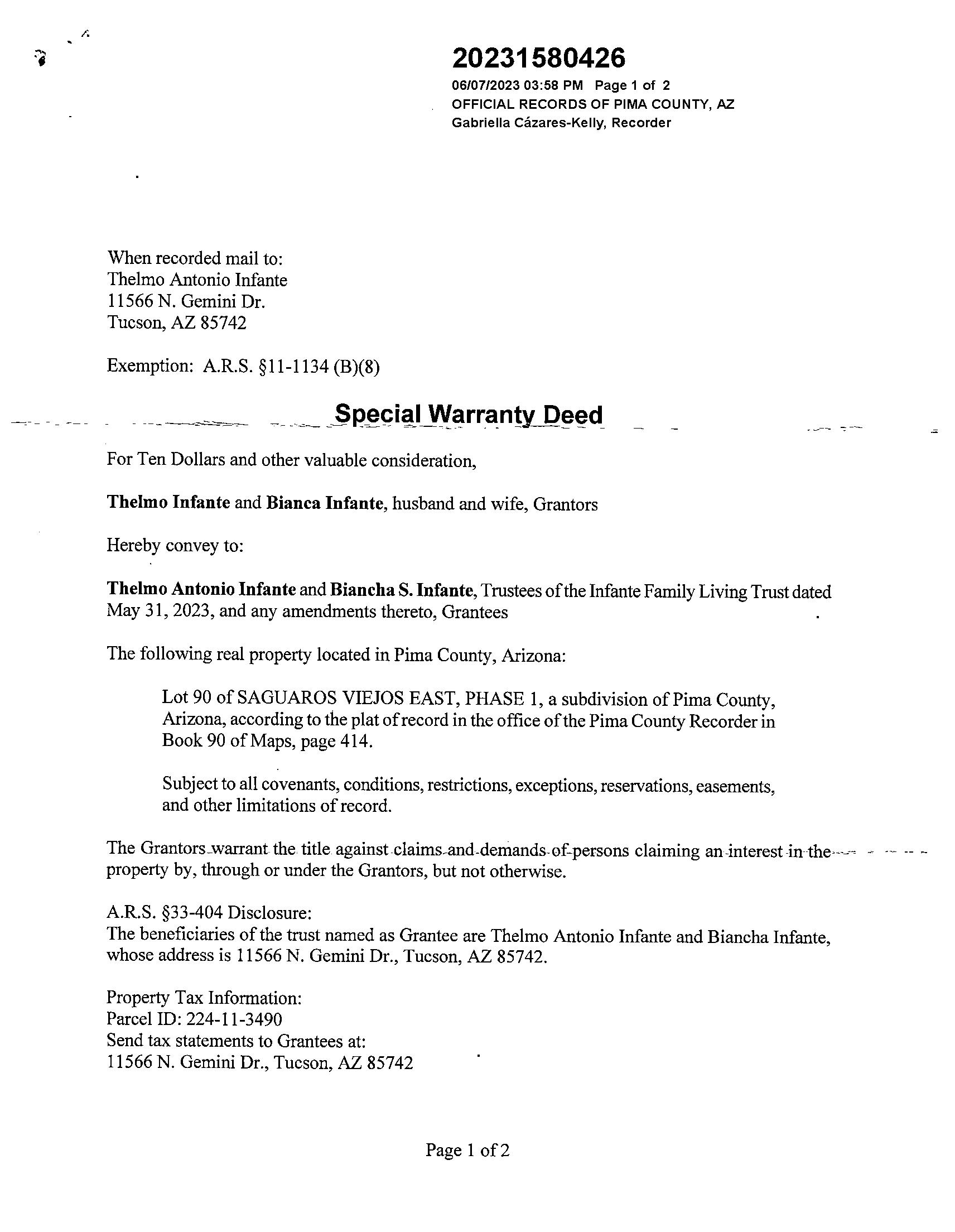 Mailing Address : 11566 N Gemini Dr, Tucson AZ 85742-7922 R097