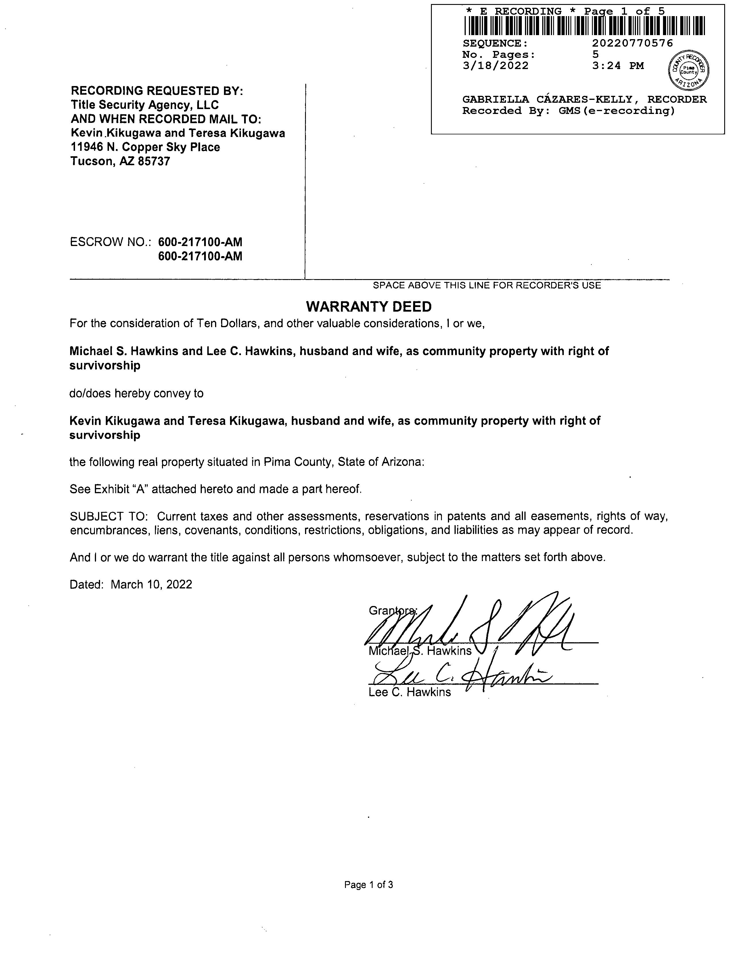 Seller Name : Hawkins Michael S & Lee C