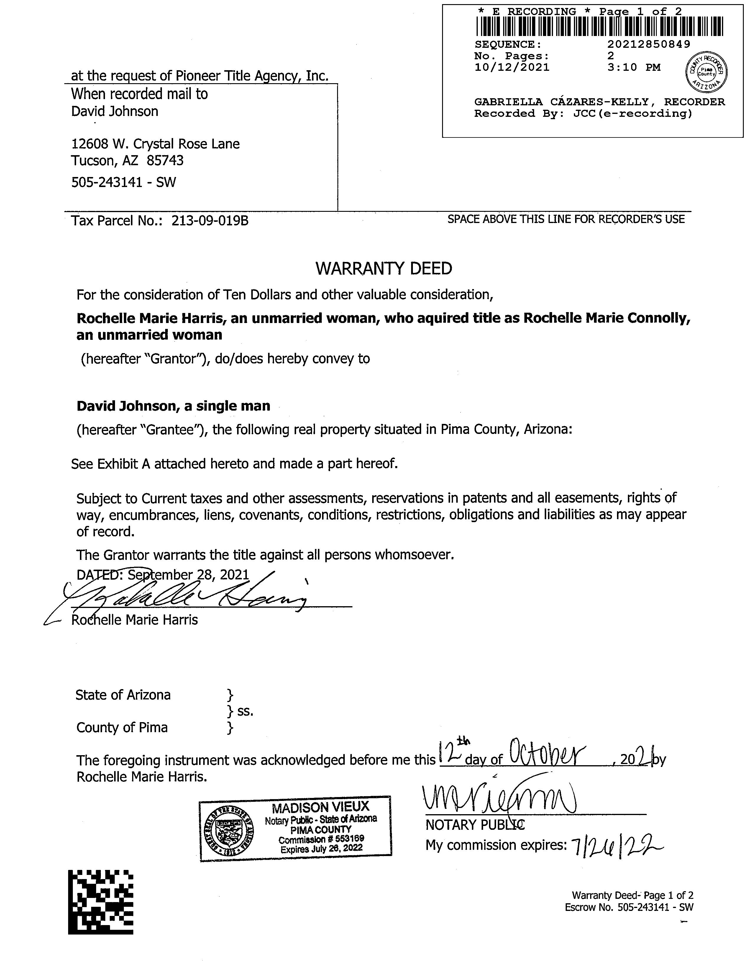 Owner Name: Johnson David / APN / Alternate APN: 213-09-019B / Deed Type: Warranty Deed