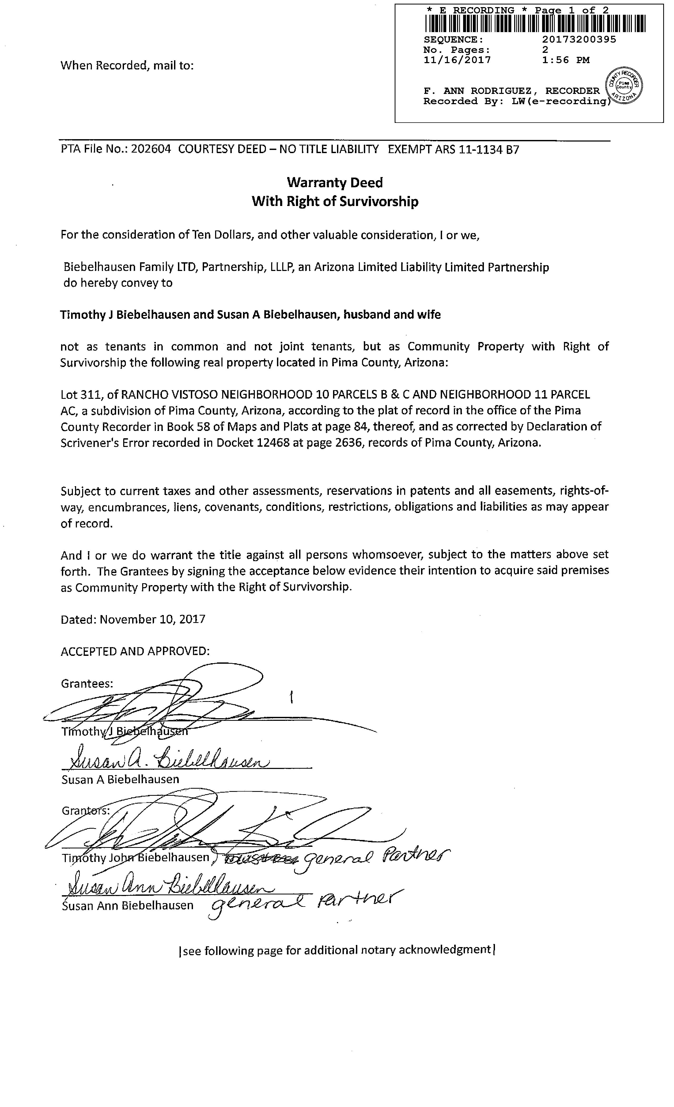 Owner Name: Biebelhausen Timothy J /Biebelhausen Susan A APN / Alternate APN: 219-19-8120 / Deed Type: Special Warranty Deed