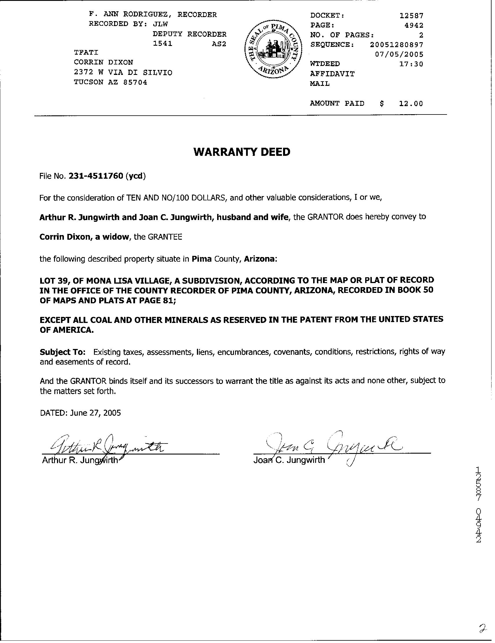 Owner Name : Dixon Corrin M Mailing Address : 2372 W Via Di Silvio, Tucson AZ 85741-4204 C010