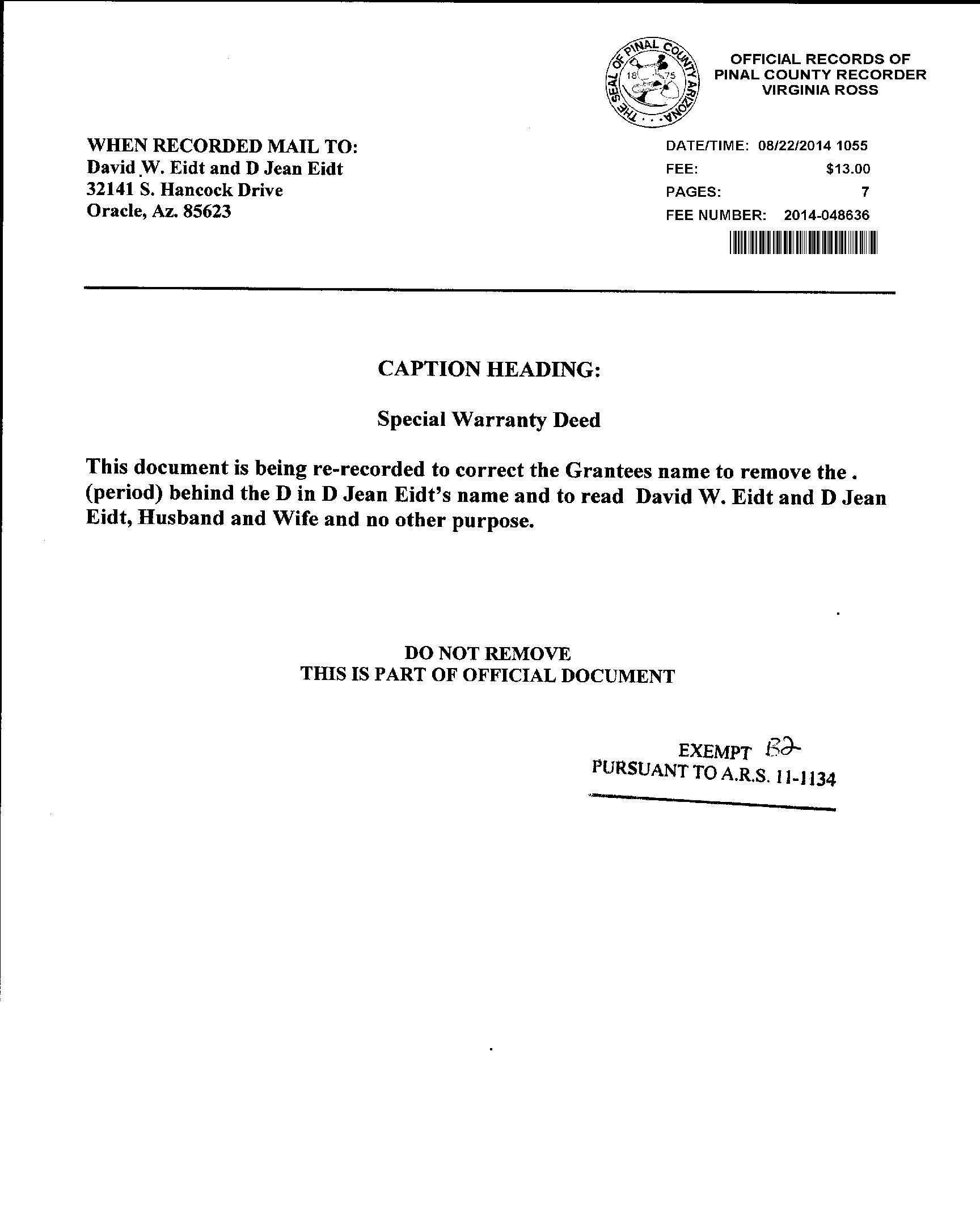 Mailing Address : 32141 S Hancock Dr, Oracle AZ 85623-7332 H002