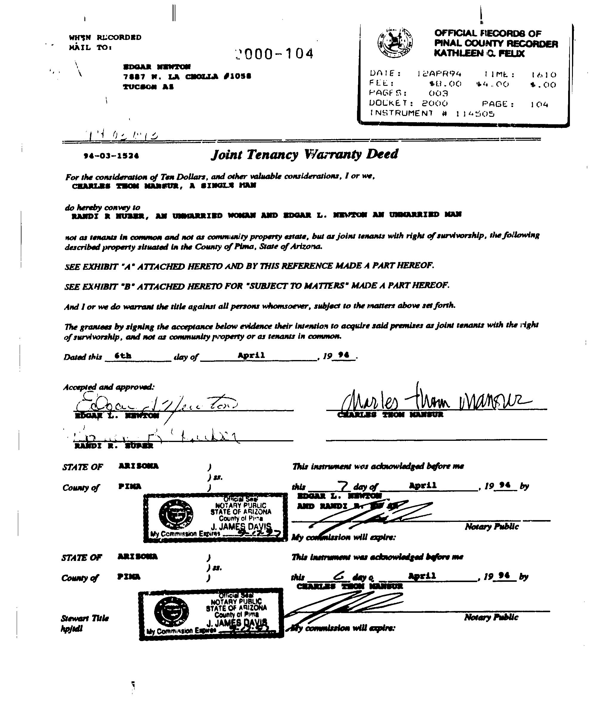 Legal Description : Diamond Bell Ranch Tucson Unit 10 Lot 120 (11066/518 11274/1096)