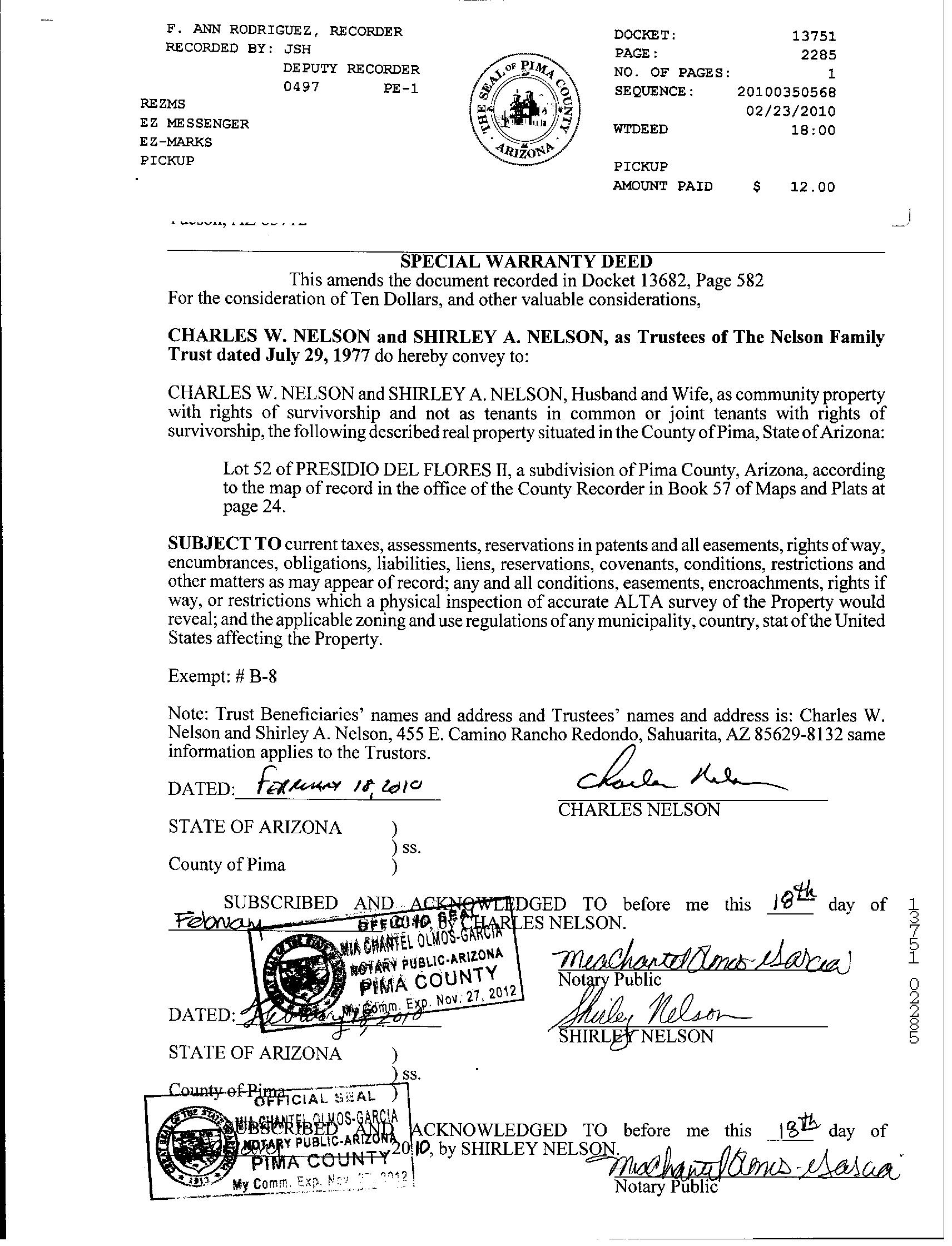 Sahuarita Az 85629 Owner Name: Parra Francisco E Jr /Parra Luz E APN / Alternate APN: 303-73-2200 / Deed Type: Warranty Deed Land Use: Sfr Subdivision / Tract: Sahuarita Presidio De Arboles / Lot Size: 4,400 Year Built / Eff: 2005 / Rec. Date / Price: 04/20/2023 / $277,500 Living Area: 1,393 # of units: Document #: 1100539 Bedrooms: Pool: Total Tax Value: $176,338 Bath(F/H): / #9 14491 S Camino Larga Vis Sahuarita Az 85629 Owner Name: Castro Maria E C / APN / Alternate APN: 303-73-3550 / Deed Type: Warranty Deed Land Use: Sfr Subdivision / Tract: Presidio De La Tierra / Lot Size: 5,175 Year Built / Eff: 2004 / Rec. Date / Price: 03/18/2024 / $290,000 Living Area: 1,594 # of units: Document #: 780427 Bedrooms: Pool: Total Tax Value: $195,338 Bath(F/H): / Customer Name : Kariann Keomaka Customer Company Name : First American Title Insurance Company Prepared On : 04/11/2024 © 2024 CoreLogic. All rights reserved