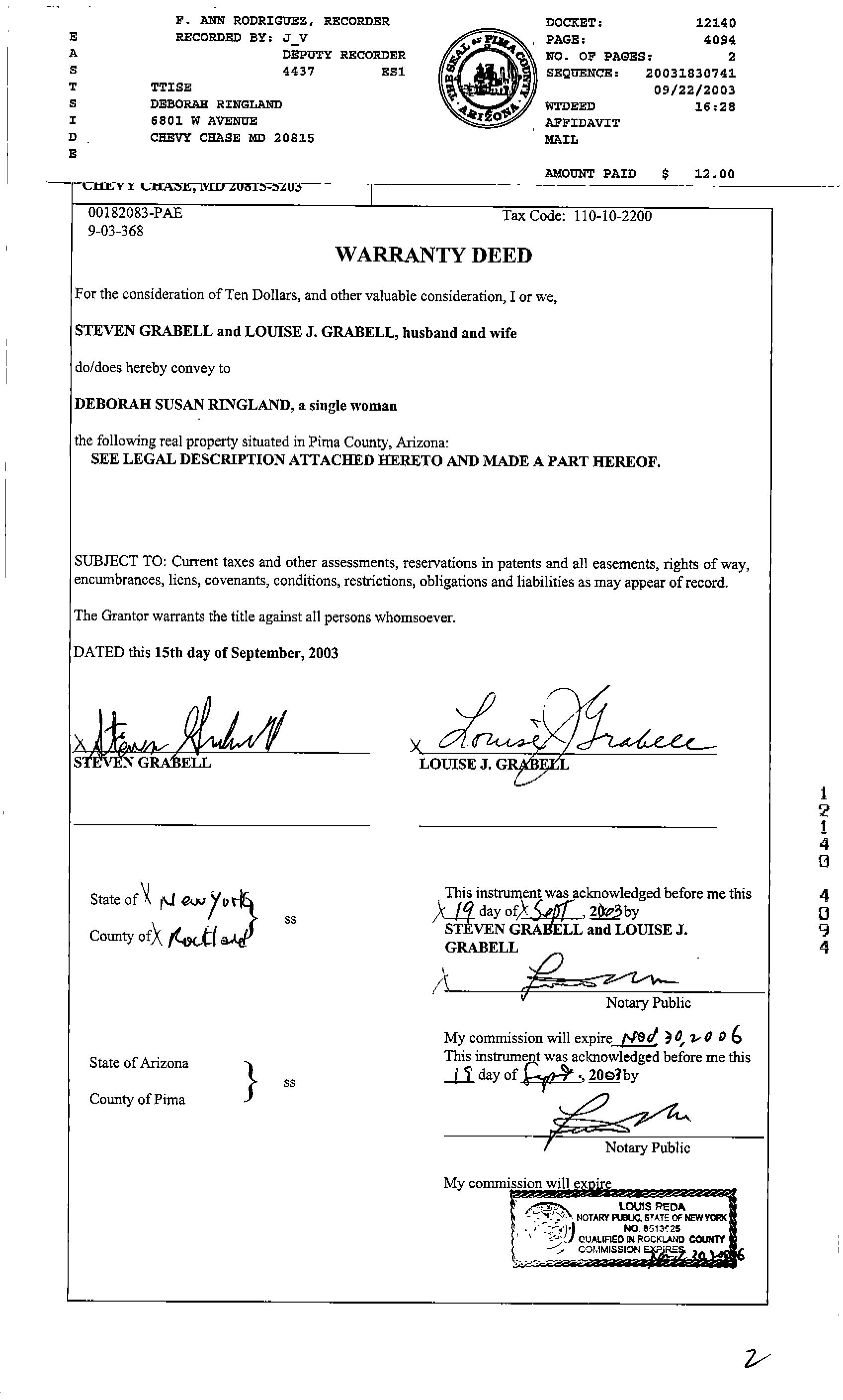 Owner Name: Ringland Deborah Susan / APN / Alternate APN: 110-10-2200 / Deed Type: Warranty Deed